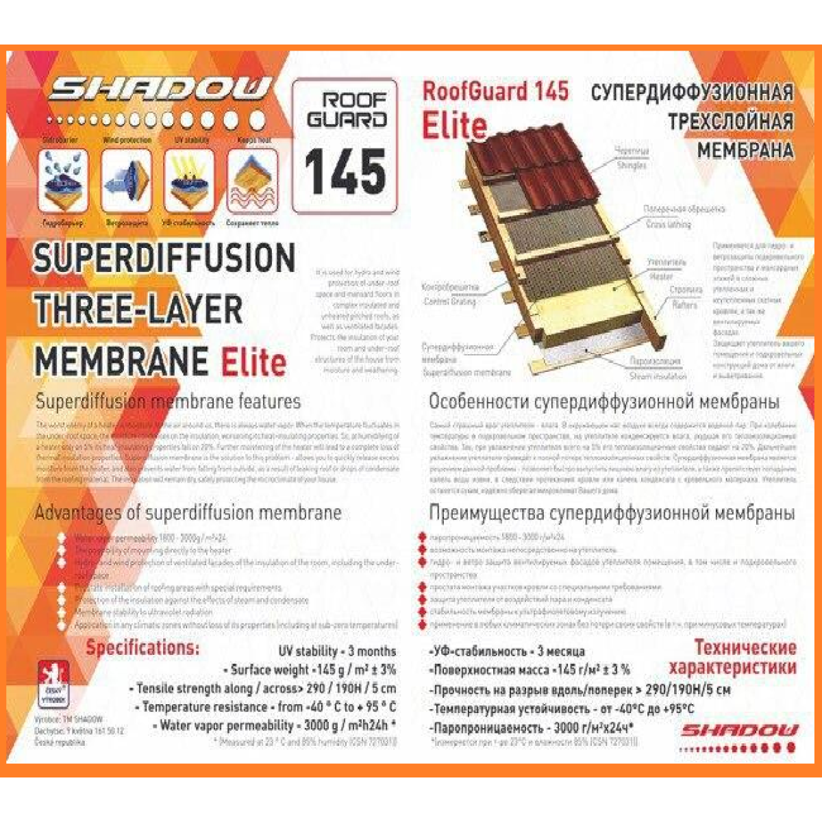 Гідроізоляційна Мембрана “Shadow“ 145 г/м2 (1,5*50) застосовується: для гідро - і вітрозахисту підпокрівельного простору і мансардних поверхів; у складних утеплених скатних покрівлях; у вентильованих фасадах; для захисту утеплювача приміщення і підпокрівельних конструкцій будинку від вологи; для защиты утеплителя помещения и подкровельных конструкций дома от выветривания. Особенности Мембрана гидроизоляционная “Shadow“ Самый страшный враг утеплителя — влага. В окружающем нас воздухе всегда содержится водяной пар. При колебании температуры в подкровельном пространстве, на утеплителе конденсируется влага, ухудшая его теплоизоляционные свойства. Так, при увлажнении утеплителя всего на 5% его теплоизоляционные свойства падают на 20%. Дальнейшее увлажнение утеплителя приведет к полной потере теплоизоляционных свойств. Супердиффузионная мембрана является решением данной проблемы — позволяет быстро выпустить лишнюю влагу из утеплителя, а также препятствуют попаданию капель воды из вне, в следствии протекания кровли или капель конденсата с кровельного материала. Утеплитель остается сухим, надежно оберегая микроклимат Вашего дома. Преимущества Мембрана гидроизоляционная “Shadow“ 145 г/м² (1,5*50) паропроницаемость мембраны составляет 1800-3000 г/м² х 24; возможность монтажа непосредственно на утеплитель; гидро- и ветрозащита вентилируемых фасадов утеплителя помещений, в том числе и подкровельного пространства; простата монтажа участков кровли со специальными требованиями; защита утеплителя от воздействия пара и конденсата; стабильность мембраны к ультрафиолетовому излучению; применение в любых климатических зонах без потери своих свойств (в т.ч. при минусовых температурах) Благодаря эффективному планированию всей системы производства и современному оборудования чешский производитель “Shadow“ выпускает только качественную продукцию и дает гарантию не менее 5 лет на весь товарный ряд торговой марки.