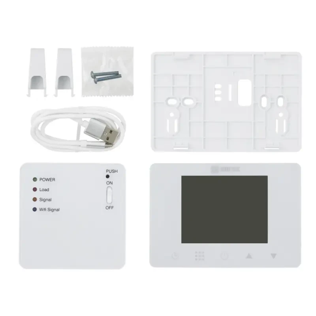 Комплект поставки: терморегулятор, приймач, гвинти кріплення, планка-кріплення на стіну, ніжки для настільної установки, інструкція, кабель-USB.