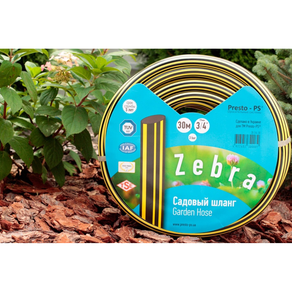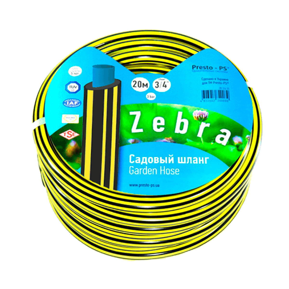 Особливості Шланг поливальний Presto-PS Зебра (ZB 3/4 30) діаметром 19 мм (3/4“) завдовжки 30 метрів виготовляється з якісної первинної сировини, стійкий до впливу води й органічних і неорганічних добрив. Зовнішній шар виготовлений із ПВХ із додаванням гуми характеризується гарною гнучкістю й еластичністю, захищає шланг від фізичного зносу та дії ультрафіолетового випромінювання. Середній шар являє собою армувальне обплетення з хрещатим плетінням, зроблене із синтетичного волокна, вона захищає шланг від розривів і робить його стійким до впливу тиску до 4 атмосфер. Внутрішній шар із харчового полівінілхлориду зеленого кольору має гладку стінку, не створює перешкоду потоку рідини та не містить у своєму складі домішок шкідливих для довкілля. Ці шланги використовуються для всіх видів зрошення присадибних ділянок, городів, так само застосовується на будівельних майданчиках, для миття авто та мототехніки, садового інструменту, прибудинкової території. Може використовуватися для транспортування питної води та інших харчових рідин. Унікальні риси серії Зебра Тришарові армовані шланги для поливання серії Зебра виготовлені на українському заводі, обладнаному високоякісним турецьким обладнанням. Вирізняються високою міцністю, підвищеною еластичністю, стійкістю до руйнівної дії ультрафіолету. Допускають використання в широкому діапазоні зовнішніх температур від +60 до -5 °C без зміни своїх початкових експлуатаційних характеристик. Не містять у своєму складі шкідливих домішок свинцю, кадмію й барію. Міцне армування полімерною ниткою робить шланг зручним у роботі, стійким до перегинів, дає змогу зберігати свою цілісність і еластичність у разі тривалої експлуатації на високих тисках. Застосування у виробництві якісної сировини та матеріалів дає можливість експлуатації шлангів цієї серії терміном до 5-6 років. Переваги Підвищена гнучкість і еластичність; Стійкі до перегинів; Стійкі до дії підвищеного тиску; Стійкі до дії ультрафіолету; Стійкі до фізичного зношування та розривів;Тривалий термін експлуатації. Застосування Зрошення садів, городів, парників; Миття авто/мототехніки, велосипедів; Миття прибудинкової території, садового інвентарю; Подавання води в поливальну систему; Транспортування питної води. Приклади використання шланга З дощівниками: Змонтувати перехідник/трійник із зовнішньою різзю 3/4 у магістральну трубу; Приєднати до нього таймер для поливання ; За допомогою стандартного конектора з“єднати шланг із виходом таймера;Під“єднати конектором з аквастопом з протилежного боку шланга дощівник;Встановити дощівник у місці проведення поливання;Відрегулювати за потреби сектор або режим поливання;Подати воду в магістральну трубу; Виставити на таймері необхідний час і дні поливу (підробне описування параметрів дивіться в інструкції, що додається).З поливальними пістолетами: Змонтувати кран для під“єднання конекторів у підіймальну трубу; За допомогою стандартного конектора з“єднати короткий відрізок шланга з виходом крана;Під“єднати його другим конектором із протилежного боку до входу котушки або візка;Під“єднати до адаптера котушки всередині шланг достатньої довжини до місця передбачуваного поливання,;На протилежному кінці шланга закріпити конектор з аквастопом;Під“єднати до нього поливальний пістолет; Піс
