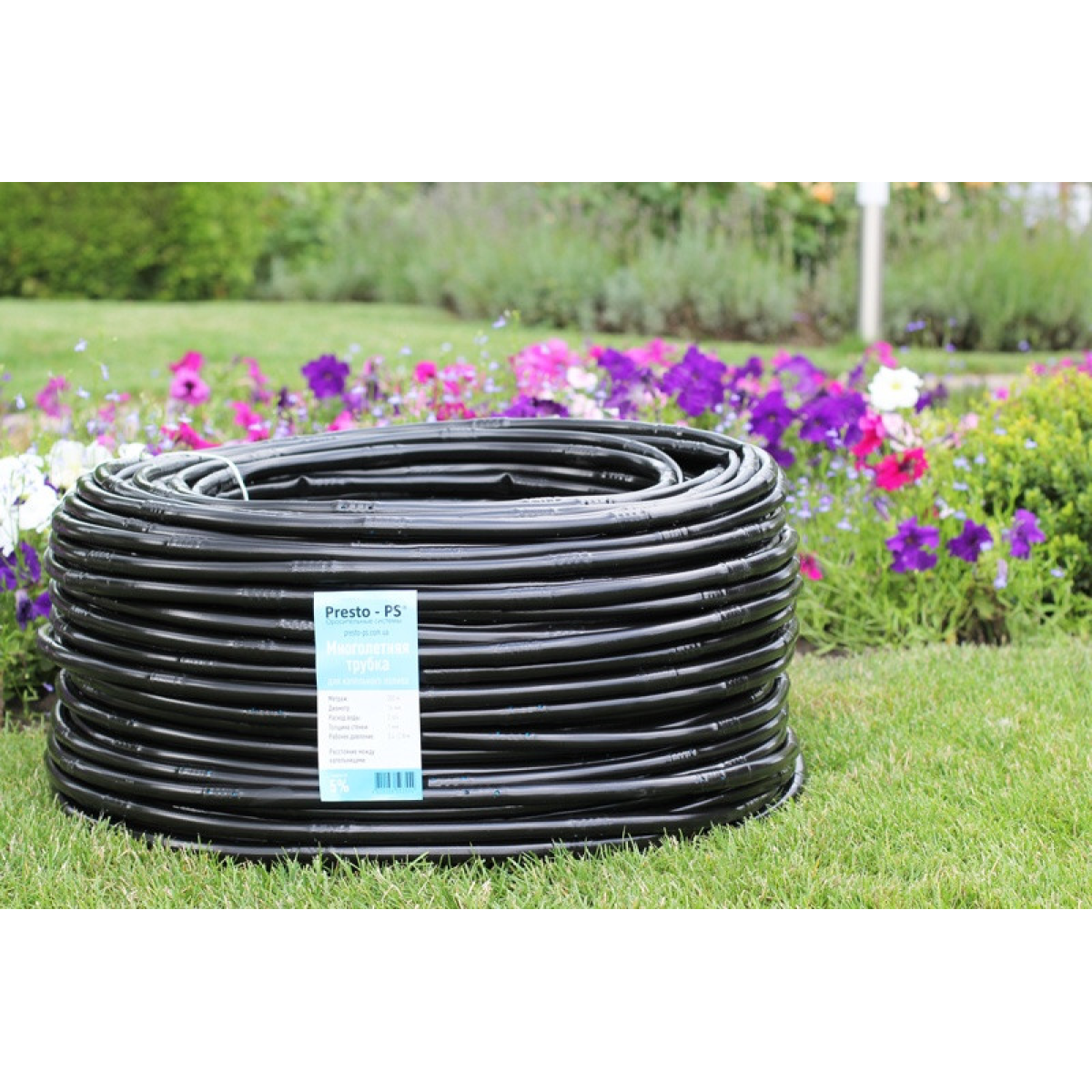 Особливості Багаторічна трубка є найбільш універсальним і ефективним рішенням для організації систем крапельного поливання. Основною перевагою крапельної трубки з вбудованими крапельницями, порівнюючи з крапельною стрічкою, є можливість її використання триваліший термін — від 3 до 7 років. Товста стінка, виготовлена з якісного матеріалу, дає змогу не прибирати трубку на зиму без зменшення терміну експлуатації. Багаторічна крапельна трубка Presto-PS (MCL-60-200) являє собою ПВХ трубку діаметром 16 мм із товщиною стінки 0.9 мм. Не має швів, задирок і зварних з“єднань. Через кожні 60 см у неї вбудовані циліндричні крапельниці (емітери) на 4 виходи з довгим фільтрувальним лабіринтом великої площі для мінімального ризику забруднення крапельниці. Витрата води з кожної крапельниці 2 л/год. Широкий асортимент фітингів дає змогу швидко та надійно створити нову зрошувальну систему або під“єднатися до вже наявної.