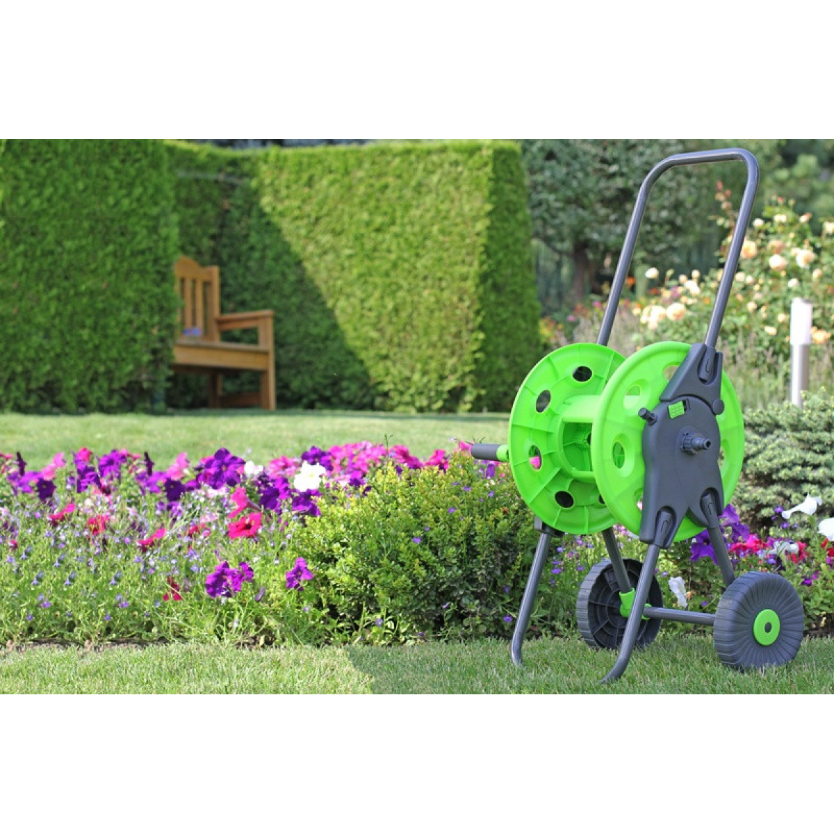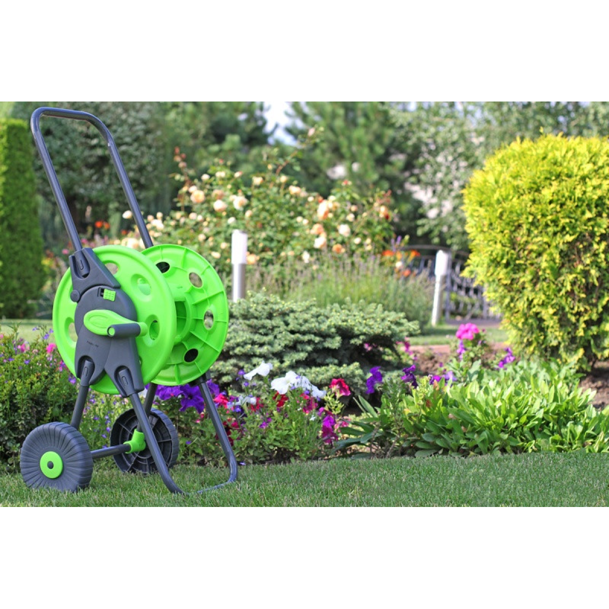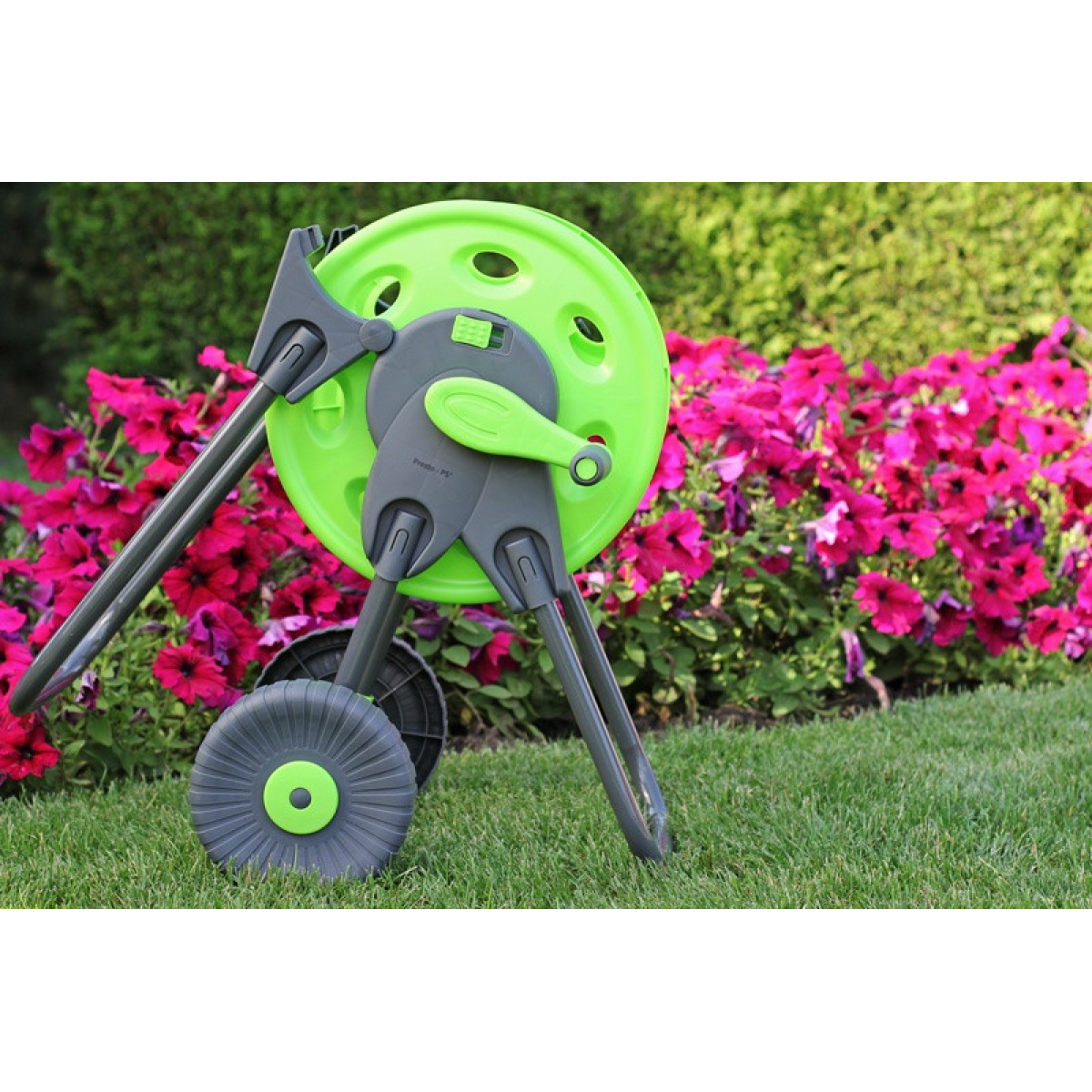 Візок для шланга Presto-PS (3301G) використовується для зберігання і транспортування шлангів до місця поливу. Вміщує від 25 до 45 метрів шлага діаметром 1/2, 5/8 і 3/4 дюйма. Підключення шланга до джерела води здійснюється за допомогою стандартних конекторів. Оснащена колесами для зручності перевезення по ділянці. Виготовлена котушка з високоякісного пластику, стійкого до механічних пошкоджень, впливу ультрафіолетового випромінювання і перепадів температур. Розміри візка в зборі 82 х 50 х 10 см. Ширина / діаметр барабана - 23,5 / 35 см.