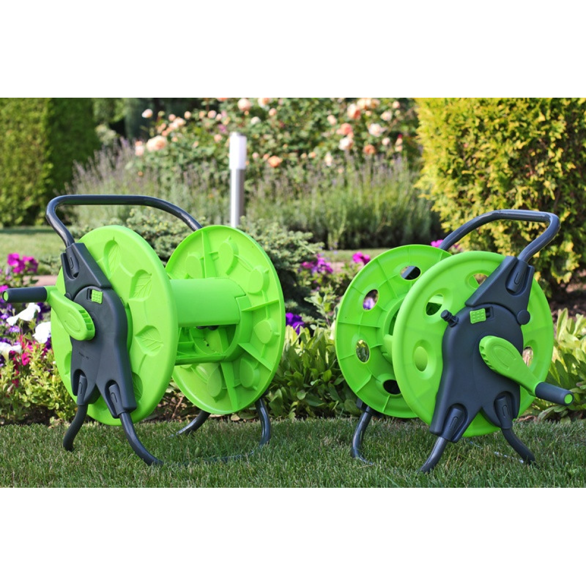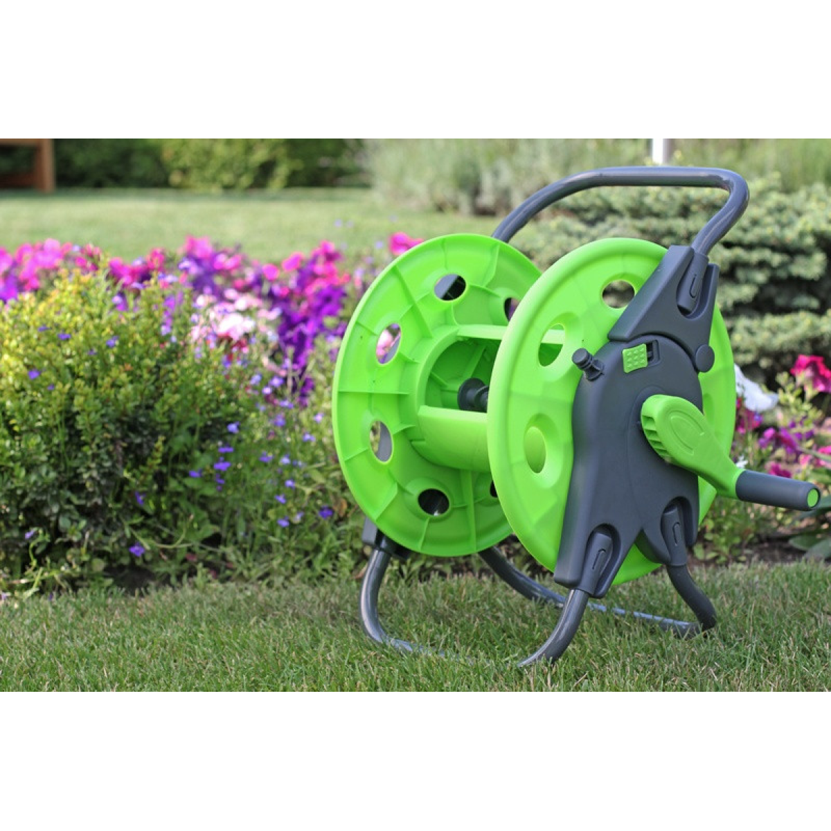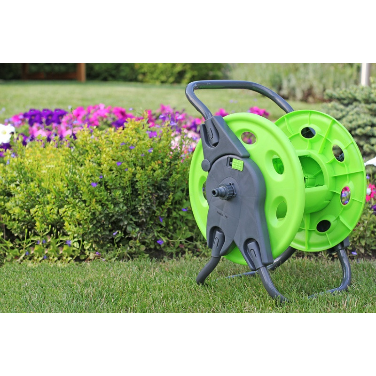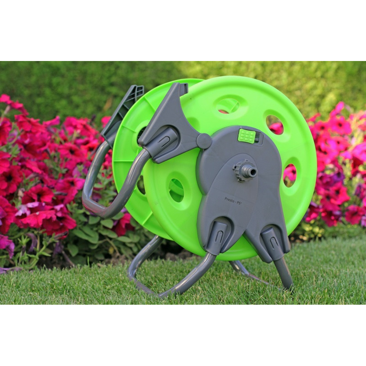 Особливості Котушка для шланга Presto-PS (3401G) використовується для зберігання і транспортування шлангів до місця поливу. Вміщує від 20 до 45 метрів шлага діаметром 1/2, 5/8 і 3/4 дюйма. Підключення шланга до джерела води здійснюється за допомогою стандартних конекторів. Виготовлена котушка з високоякісного пластику, стійкого до механічних пошкоджень, впливу ультрафіолетового випромінювання і перепадів температур. Розміри візка в зборі 50 х 50 х 10 см. Ширина / діаметр барабана - 23,5 / 35 см. Переваги Зручність використання і простота складання без застосування додаткового інструменту; Виготовлена з первинного пластику з додаванням УФ-стабілізатора; Універсальне використання для шлангів різного діаметра; Складне руків“я для економії місця під час зберігання в проміжках між поливами. Коротка інструкція з використання котушки: Зібрати котушку дотримуючись інструкції надрукованої на упаковці або за відео; За допомогою конектора і відрізка шланга того ж діаметру, який буде використовуватися, підключити котушку до джерела водопостачання; З“єднати основний шланг конектором із внутрішнім адаптером котушки;На протилежний кінець шланга змонтувати конектор с автостопом та підключити пістолет для поливу або зрошувач; Подати воду в систему; По завершенню поливу зняти зі шланга пістолет/дощувач і змотати шланг на котушку; За необхідності відкрити бічні фіксатори з двох боків і скласти рукоятку.