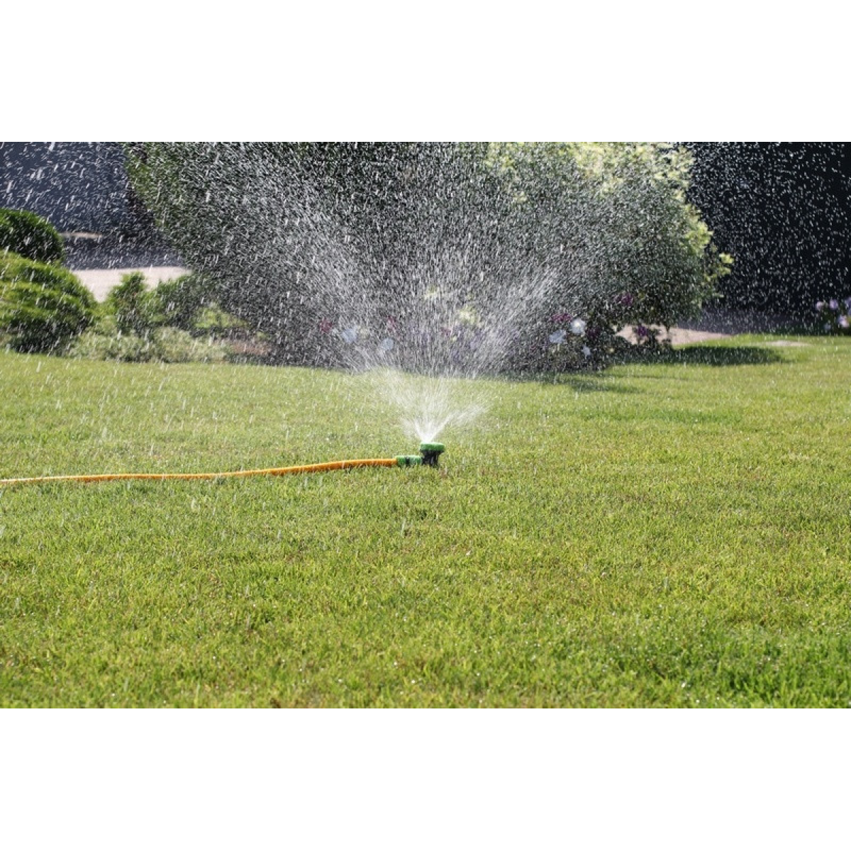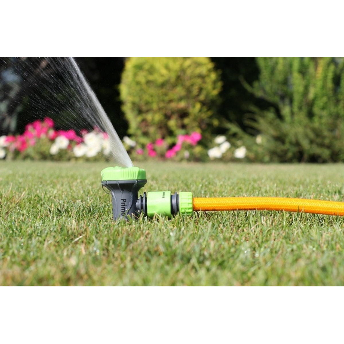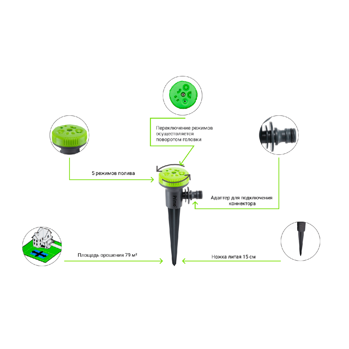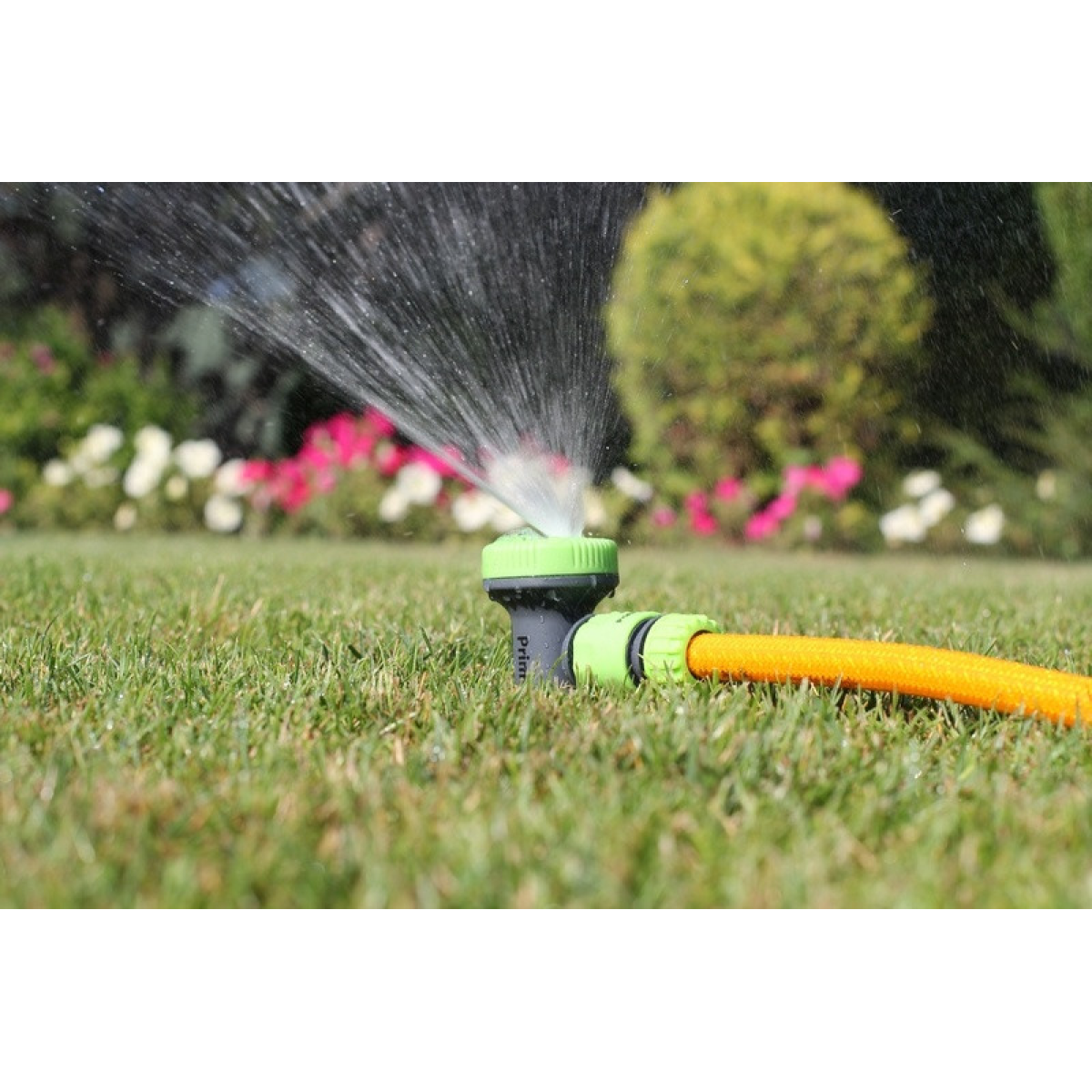 Особливості Дощувач багатофункціональний Presto-PS “Гриб“ (8108G) використовується для зрошення газонів середньої та невеликої площі, підійде так само для поливу городу та прибудинкової території. Ці зрошувачі універсальні і добре підійдуть для ділянок зі складною геометрією і змішаною рослинністю. Поворотна головка зрошувача з різними видами форсунок дає змогу вибрати форму зрошуваного сектора і вид розпилення з 5 варіантів. Можливі режими поливу: круговий, секторний, прямокутний, трикутний, плоский. Підключається до садових шлангів діаметром 1/2, 5/8 і 3/4 дюйма за допомогою стандартних конекторів. Мінімальний діаметр поливу 5,5 метрів, максимальний 10 метрів. Площа поливу становить до 79 м?. Рекомендований робочий тиск у системі від 2 до 4 атмосфер. Витрата води за тиску 2 атмосфери до 0,6 м?/год. Виготовлений зрошувач з якісного пластику, довговічний, стійкий до впливу ультрафіолету і водорозчинних добрив. Переваги Простота установки; Універсальність використання - 5 режимів поливу;Зміна режиму роботи простим поворотом головки;Дозволяє вносити водорозчинні добрива;Збереження оптимального рівня вологості ґрунту і повітря. Коротка інструкція з монтажу зрошувача: Підключити гнучкий садовий шланг через кран та стандартний конектор до джерела водопостачання; За допомогою другого конектора під“єднати шланг до дощовиків; Встановити зрошувач на місце поливу; Відрегулювати сопла; Подати воду в систему. Площа поливу і витрата залежно від режиму: Режим Діаметр, мДовжина, м Ширина, м Кут поливу, ° Площа поливу, м? Витрата води, м?/год Трикутний * 5,5 * 90 23,75 0,2 Круговий 5 * * * 19,63 0,4 Секторний * 12 2,4 * 28,8 0,63 Плоский * 6,2 5,5 * 34 0,4 Прямокутний * 10 2 * 20 0,55