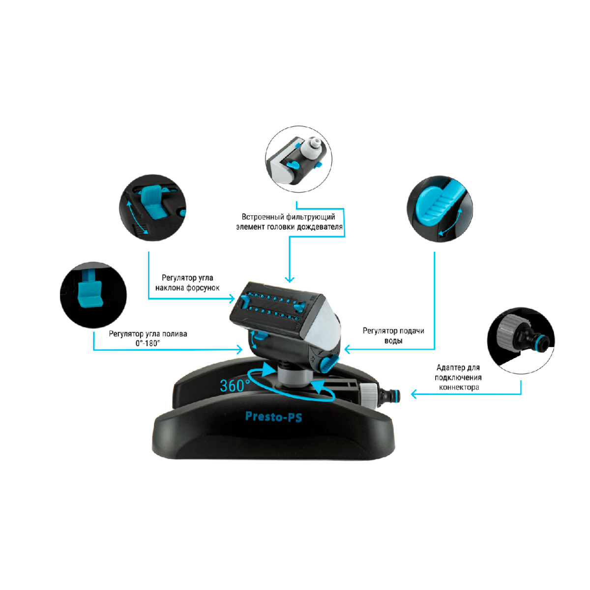 Стійка підставка;Висока ефективність і рівномірність поливу;Регульований механізм повороту для регулювання форми поливу;Дозволяє вносити водорозчинні добрива;Тривалий термін експлуатації. Коротка інструкція з монтажу зрошувача: