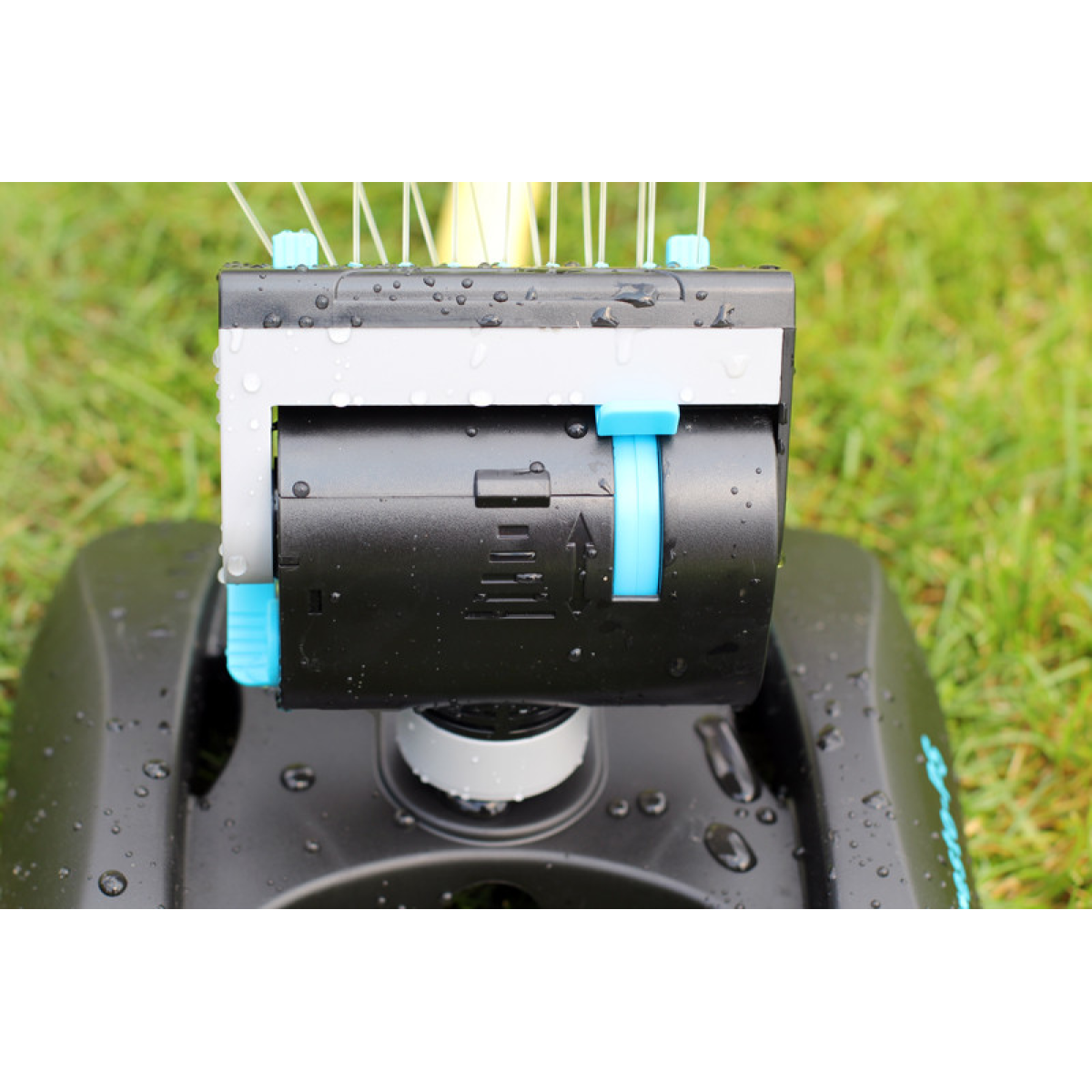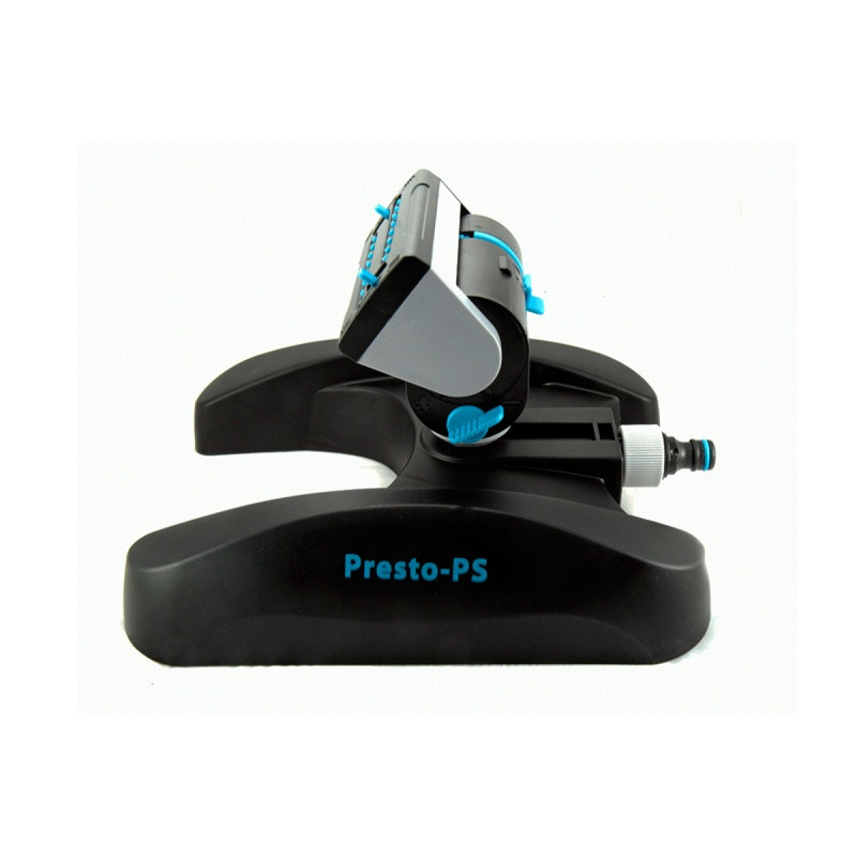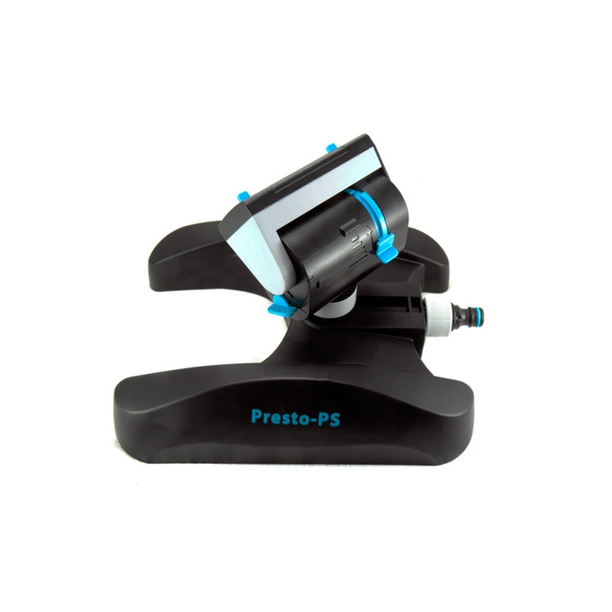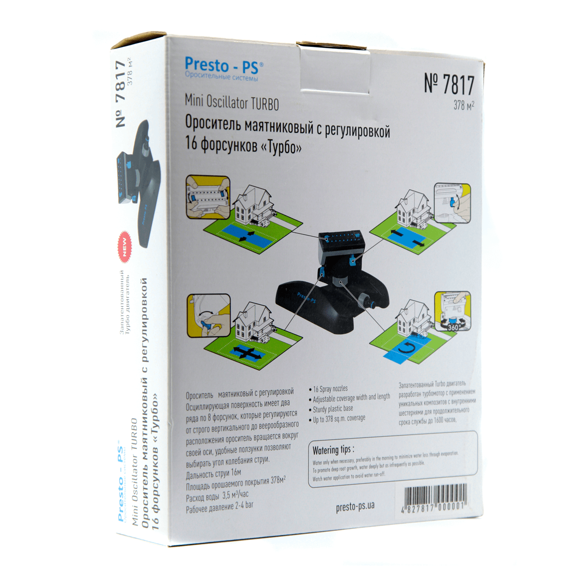 Дощувач осцилюючий Presto-PS Турбо (7817) використовується для зрошення середніх і невеликих газонів, підійде так само і для поливу городу. Ці зрошувачі розбризкують воду тонкими струменями, імітуючи природний дрібний дощ, і обробляють прямокутний сектор ділянки розміром 14 х 16 метрів площею до 224 м2. У конструкції дощовиків використовується довговічний автоматичний запатентований автоматичний турбомотор із застосуванням унікальних композитних матеріалів, який працює від води, що проходить через нього. Осцилювальна насадка зрошувача має два ряди по 8 форсунок, які регулюються за шириною захвату від вертикального до віялоподібного розпилення. Додатково регулюється кут повороту головки зрошувача і кількість води, що подається. Це легко дає змогу налаштувати цей зрошувач під різну форму ділянки. Робочий тиск 2-4 атмосфери. Витрата води при тиску 2 атмосфери до 0,5 м?/год. Для продовження терміну служби зрошувача рекомендується використання в системі подачі води фільтра грубого очищення. Сопла виготовлені з гуми і легко чистяться комплектною голкою для форсунок. Підключається зрошувач до садових шлангів діаметром 1/2, 5/8 і 3/4 дюйма за допомогою стандартних конекторів.