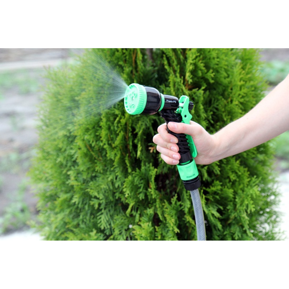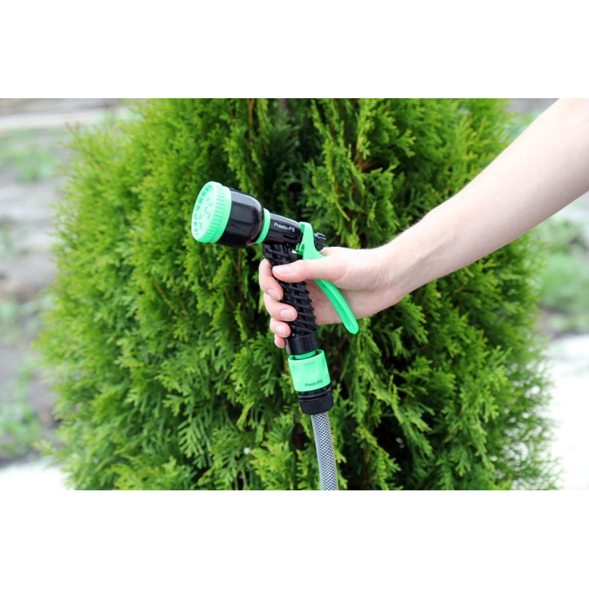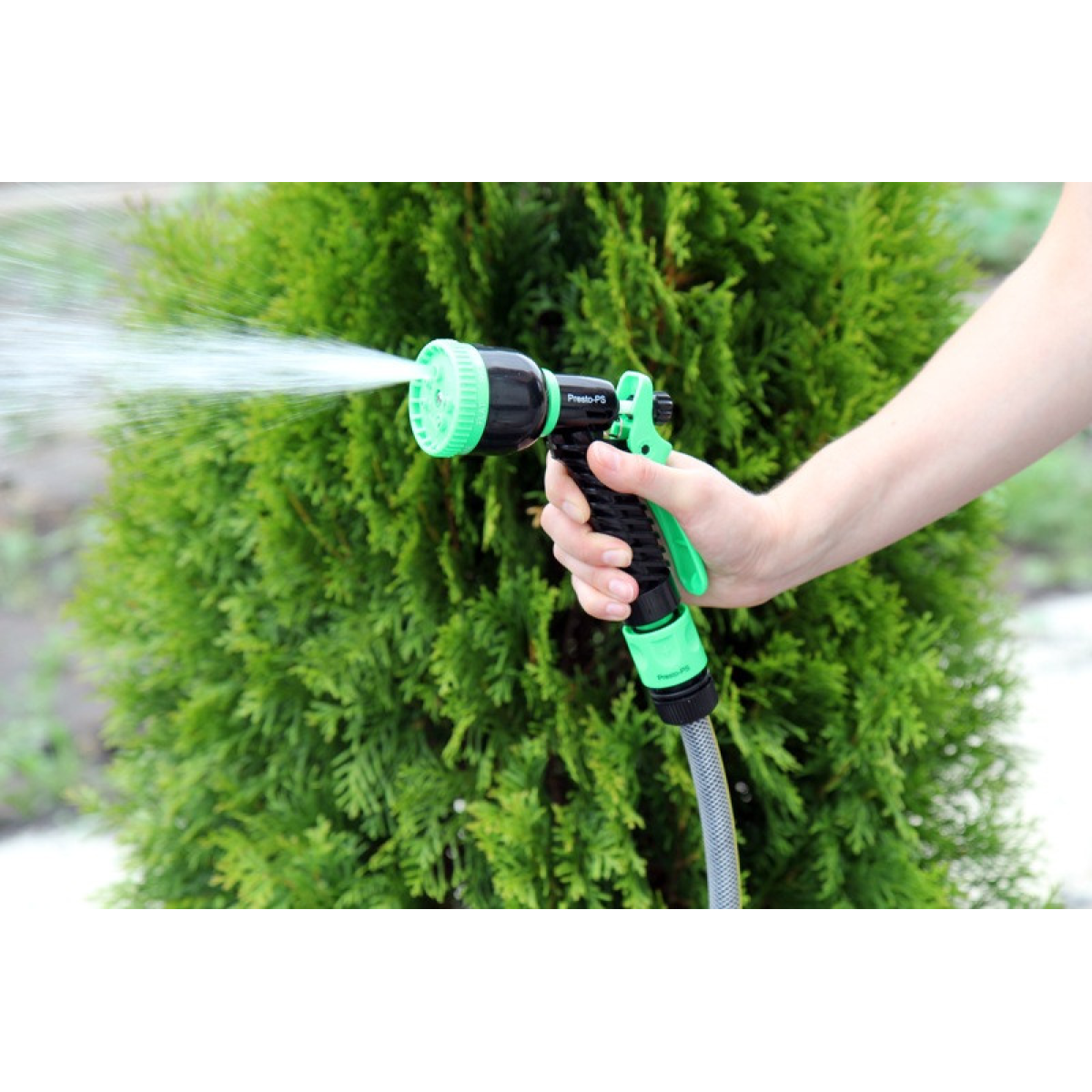 Особливості Пістолет для поливання Presto-PS (4449) використовується для ручного поливання газонів середньої та невеликої площі, городів, квітників, прибирання доріжок на прибудинковій території, миття садового інвентарю та техніки. Поворотна головка пістолета має 7 положень і регулює форму струменя та ступінь розпилення води. Можливі режими поливання: м“який струмінь, жорстка струмінь, конус, туман, душ, плоский вертикальний, плоский горизонтальний. Під“єднується до садових шлангів діаметром 1/2, 5/8 і 3/4 дюйма за допомогою стандартних конекторів. Рекомендований робочий тиск у системі від 2 до 4 атмосфер. Виготовлений поливальний пістолет із якісного пластику, довговічний, стійкий до механічних пошкоджень, впливу ультрафіолету та водорозчинних добрив. Переваги Зручність і простота під“єднання; Універсальність використання — 7 режимів подавання води; Зміна режиму роботи простим поворотом головки;Фіксація курка для тривалого поливання; Дає змогу вносити водорозчинні добрива; Надійна, обслуговальна конструкція. Коротка інструкція з під“єднання поливного пістолета: Під“єднати гнучкий садовий шланг через кран до джерела водопостачання; За допомогою конектора з аквастопом під“єднати шланг до пістолета; Вибрати необхідний режим поливання; Ввімкнути пістолет натисканням на курок.