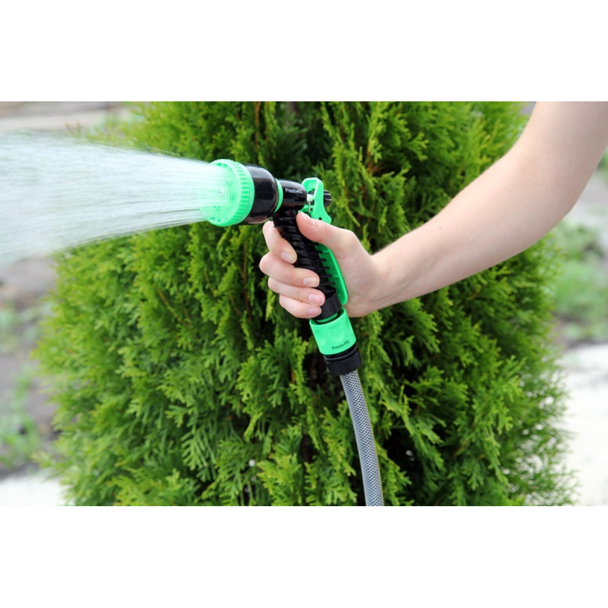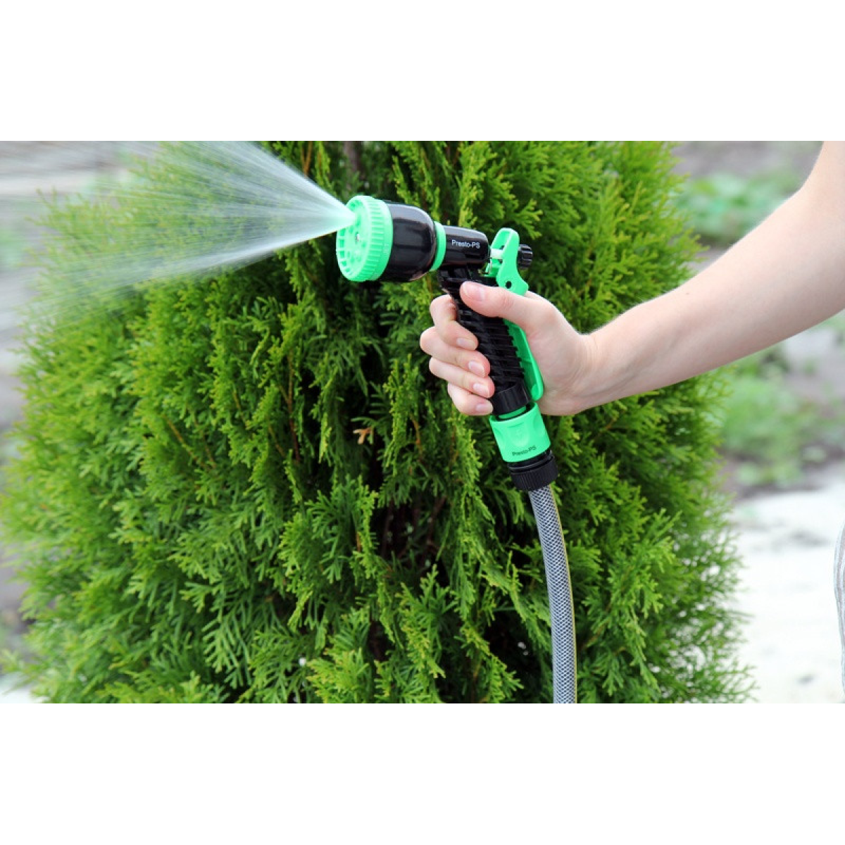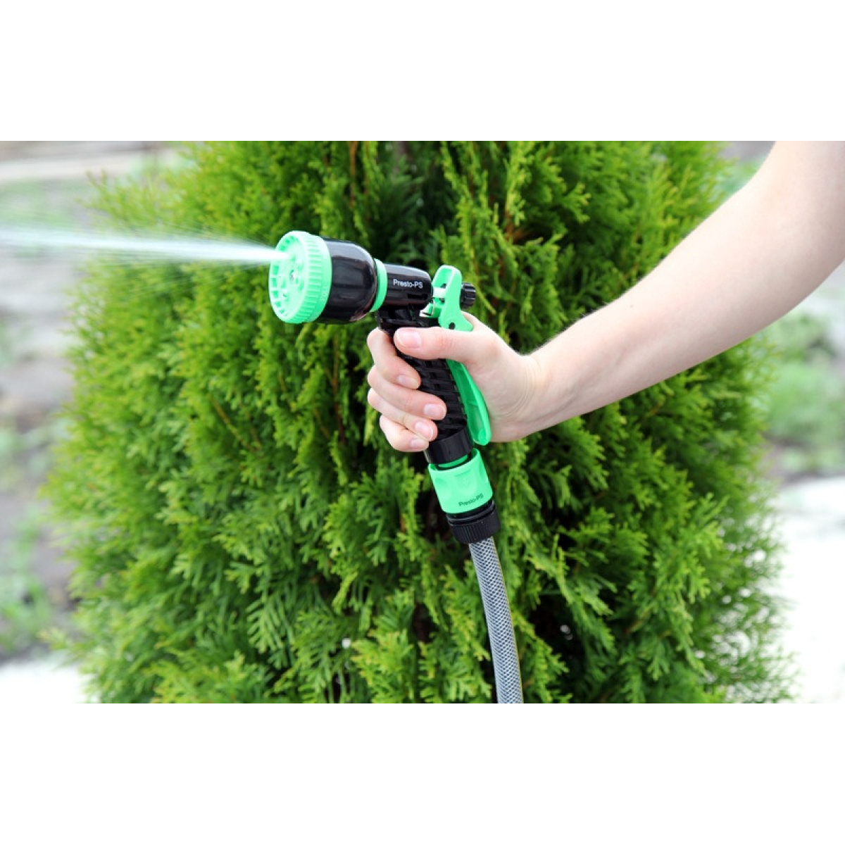 Особливості Пістолет для поливання Presto-PS (4449) використовується для ручного поливання газонів середньої та невеликої площі, городів, квітників, прибирання доріжок на прибудинковій території, миття садового інвентарю та техніки. Поворотна головка пістолета має 7 положень і регулює форму струменя та ступінь розпилення води. Можливі режими поливання: м“який струмінь, жорстка струмінь, конус, туман, душ, плоский вертикальний, плоский горизонтальний. Під“єднується до садових шлангів діаметром 1/2, 5/8 і 3/4 дюйма за допомогою стандартних конекторів. Рекомендований робочий тиск у системі від 2 до 4 атмосфер. Виготовлений поливальний пістолет із якісного пластику, довговічний, стійкий до механічних пошкоджень, впливу ультрафіолету та водорозчинних добрив. Переваги Зручність і простота під“єднання; Універсальність використання — 7 режимів подавання води; Зміна режиму роботи простим поворотом головки;Фіксація курка для тривалого поливання; Дає змогу вносити водорозчинні добрива; Надійна, обслуговальна конструкція. Коротка інструкція з під“єднання поливного пістолета: Під“єднати гнучкий садовий шланг через кран до джерела водопостачання; За допомогою конектора з аквастопом під“єднати шланг до пістолета; Вибрати необхідний режим поливання; Ввімкнути пістолет натисканням на курок.
