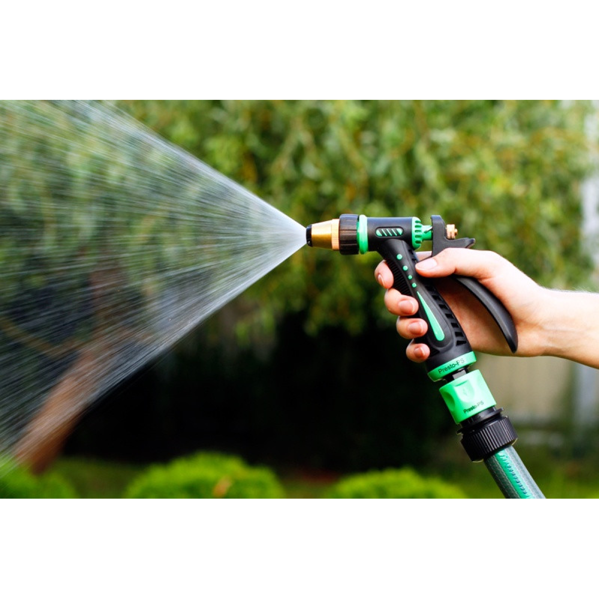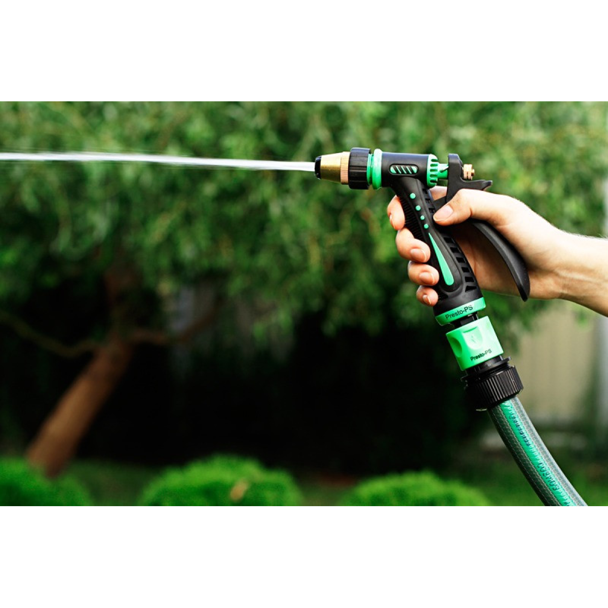 Особливості Пістолет для поливання Presto-PS (7205) використовується для ручного поливання газонів середньої та невеликої площі, городів, квітників, прибирання доріжок на прибудинковій території, миття садового інвентарю та техніки. Поворотна головка пістолета має 3 положення й регулює форму струменя та ступінь розпилення води. Можливі режими роботи: струмінь, конус, туман. Під“єднується до садових шлангів діаметром 1/2, 5/8 і 3/4 дюйма за допомогою стандартних конекторів. Рекомендований робочий тиск у системі від 2 до 5 атмосфер. Виготовлений поливальний пістолет із металу, довговічний, стійкий до механічних пошкоджень, впливу ультрафіолету та водорозчинних добрив. Форсунка з латуні для збільшення терміну експлуатації пістолета. Переваги Зручність і простота під“єднання; Універсальність використання — 3 режими подавання води;Металевий корпус стійкий до пошкоджень; Зміна режиму роботи простим поворотом форсунки;Латунна довговічна форсунка; Фіксація курка для тривалого поливання;Ергономічна прогумована ручка; Дає змогу вносити водорозчинні добрива; Надійна конструкція. Коротка інструкція з під“єднання поливного пістолета: Під“єднати гнучкий садовий шланг через кран до джерела водопостачання; За допомогою конектора з аквастопом під“єднати шланг до пістолета;Подати воду; Вибрати потрібний режим роботи.