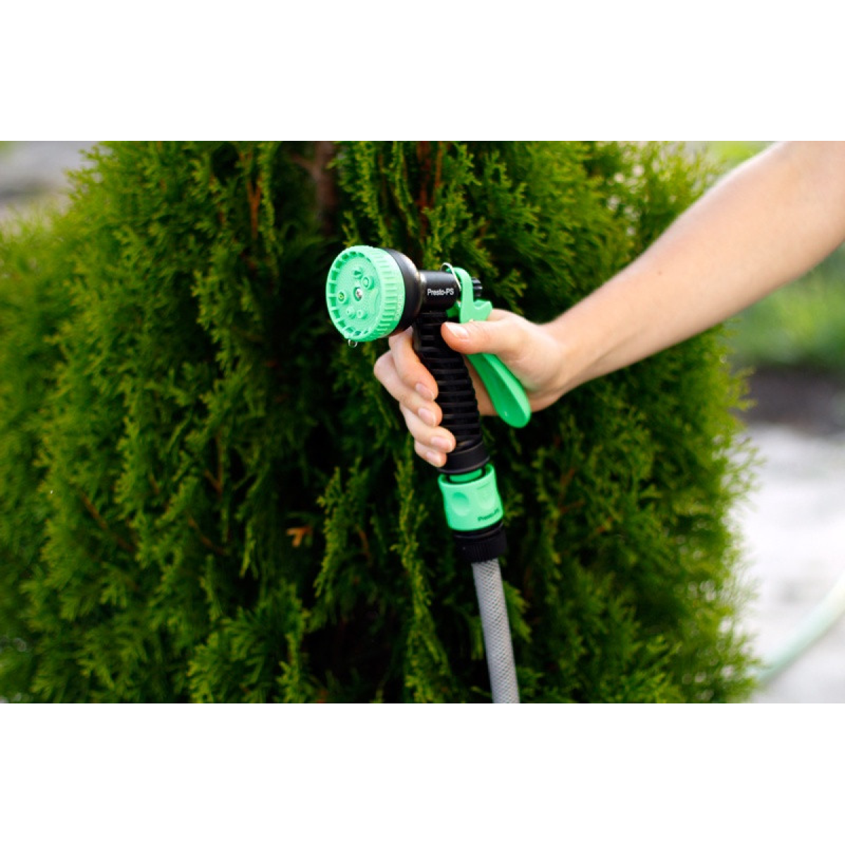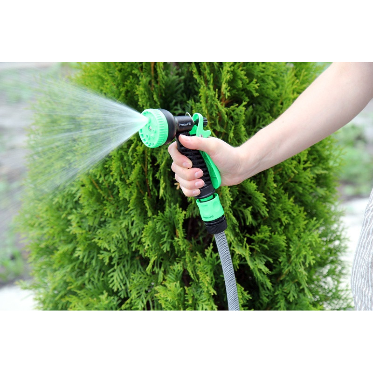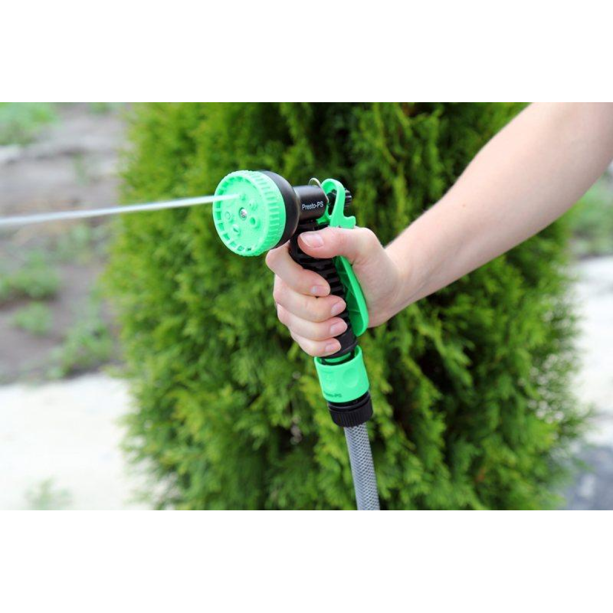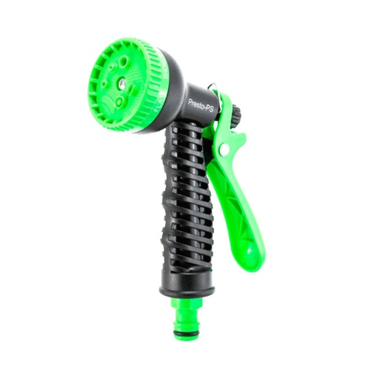 Пістолет для поливу Presto-PS (2109) використовується для ручного поливу газонів середньої та невеликої площі, городів, квітників, прибирання доріжок на прибудинковій території, миття садового інвентарю та техніки. Поворотна головка пістолета має 7 положень і регулює форму струменя і ступінь розпилення води. Можливі режими поливу: м“який струмінь, жорсткий струмінь, конус, туман, душ, проливний дощ, плоский горизонтальний. Підключається до садових шлангів діаметром 1/2, 5/8 і 3/4 дюйма за допомогою стандартних конекторів. Рекомендований робочий тиск у системі від 2 до 4 атмосфер. Виготовлений поливальний пістолет з якісного пластику, довговічний, стійкий до механічних пошкоджень, впливу ультрафіолету і водорозчинних добрив.Переваги