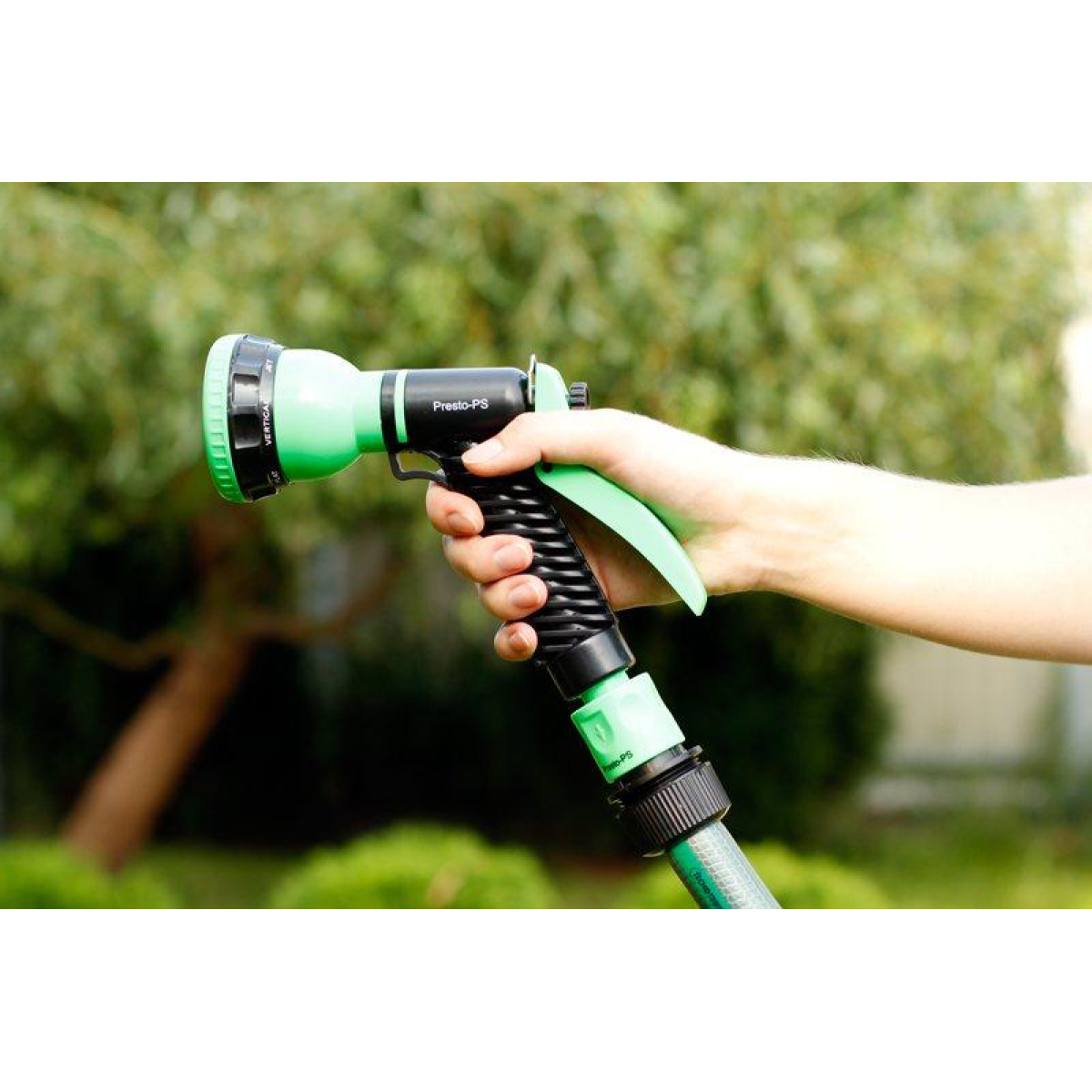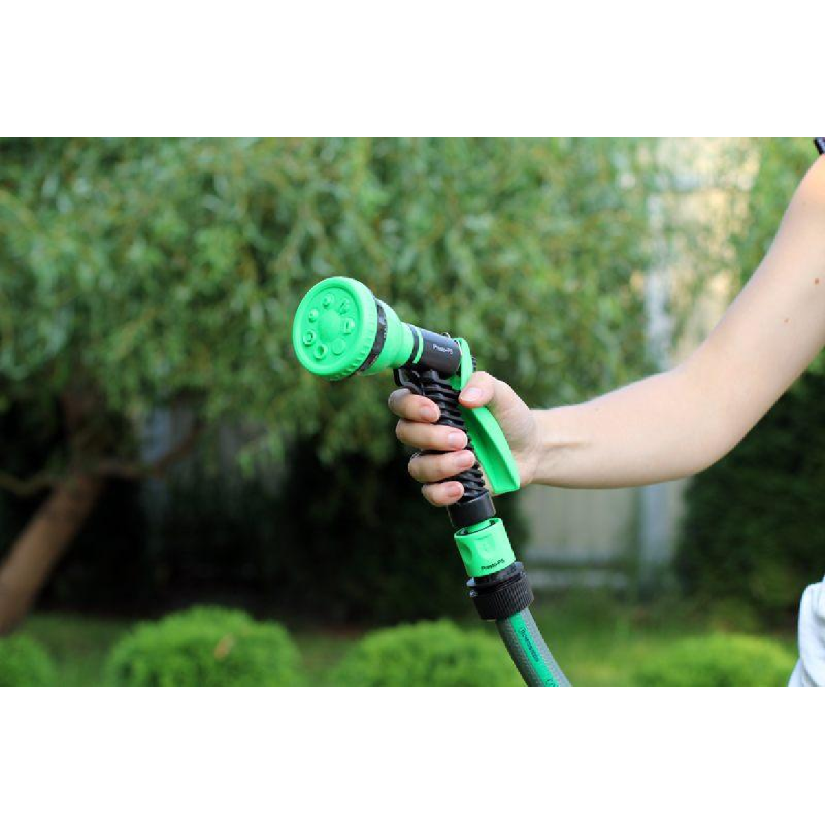 Пістолет для поливу Presto-PS (4440) використовується для ручного поливу газонів середньої та невеликої площі, городів, квітників, прибирання доріжок на прибудинковій території, миття садового інвентарю та техніки. Поворотна головка пістолета має 7 положень і регулює форму струменя і ступінь розпилення води. Можливі режими поливу: м“який струмінь, жорсткий струмінь, конус, туман, душ, плоский вертикальний, плоский горизонтальний. Підключається до садових шлангів діаметром 1/2, 5/8 і 3/4 дюйма за допомогою стандартних конекторів. Рекомендований робочий тиск у системі від 2 до 4 атмосфер. Виготовлений поливальний пістолет з якісного пластику, довговічний, стійкий до механічних пошкоджень, впливу ультрафіолету і водорозчинних добрив.