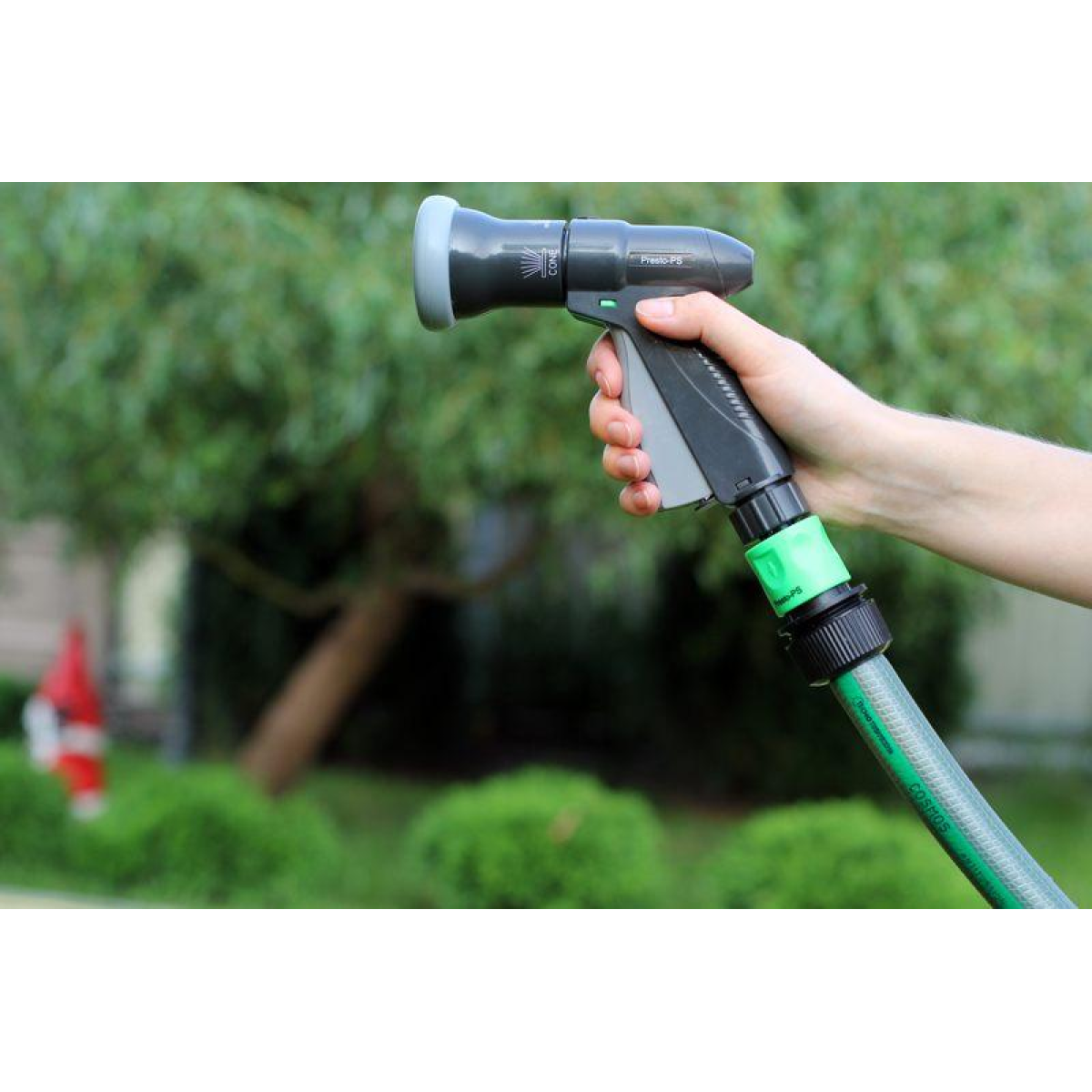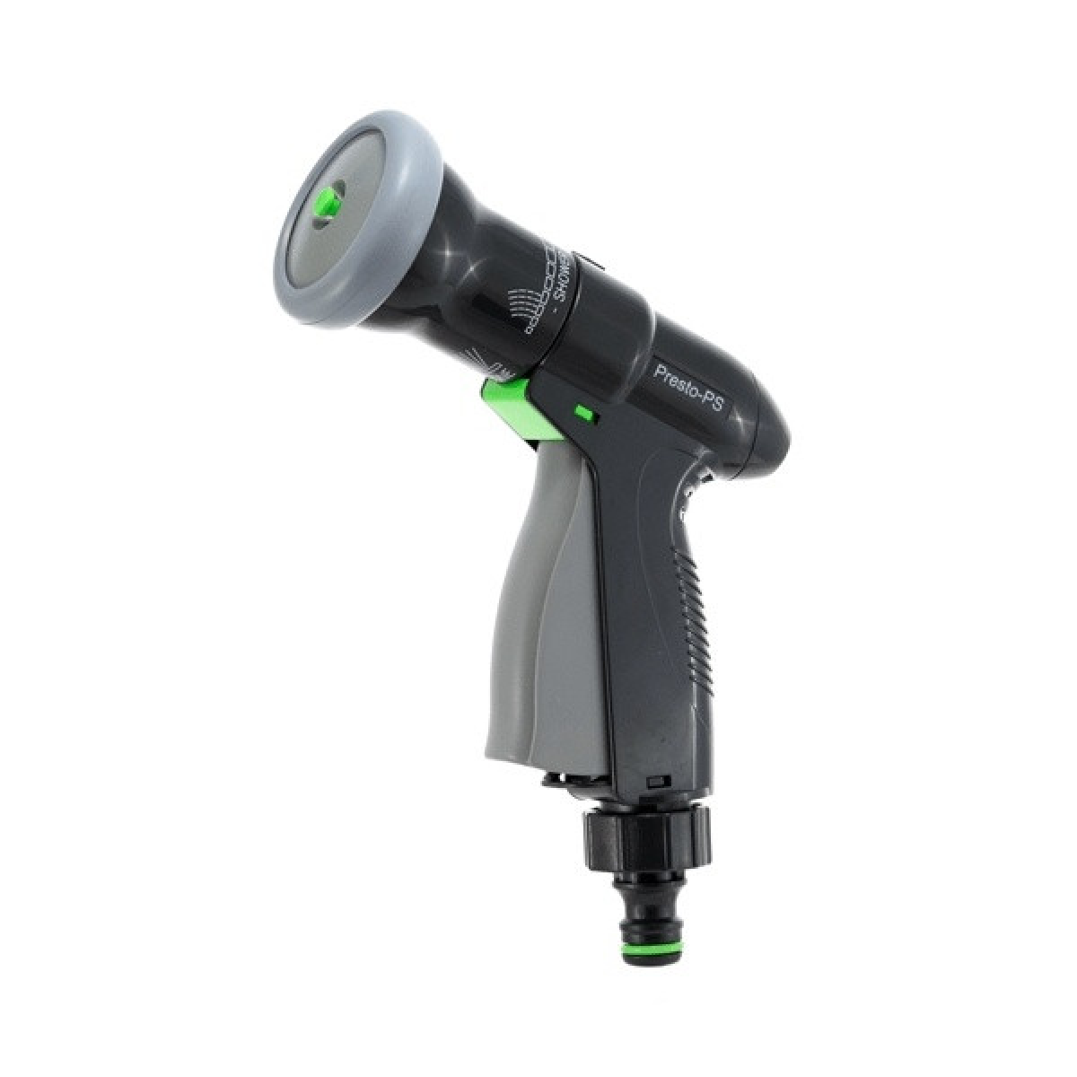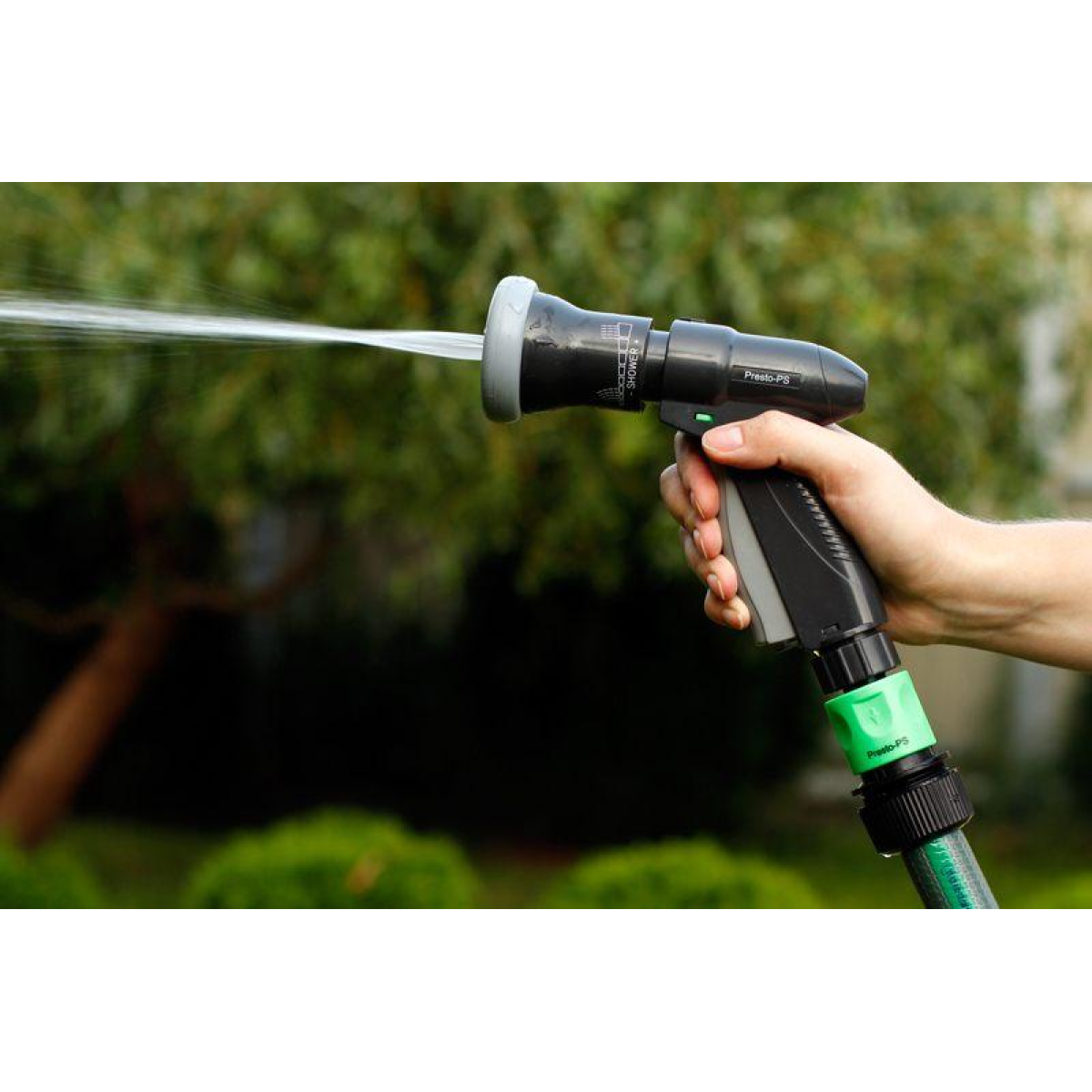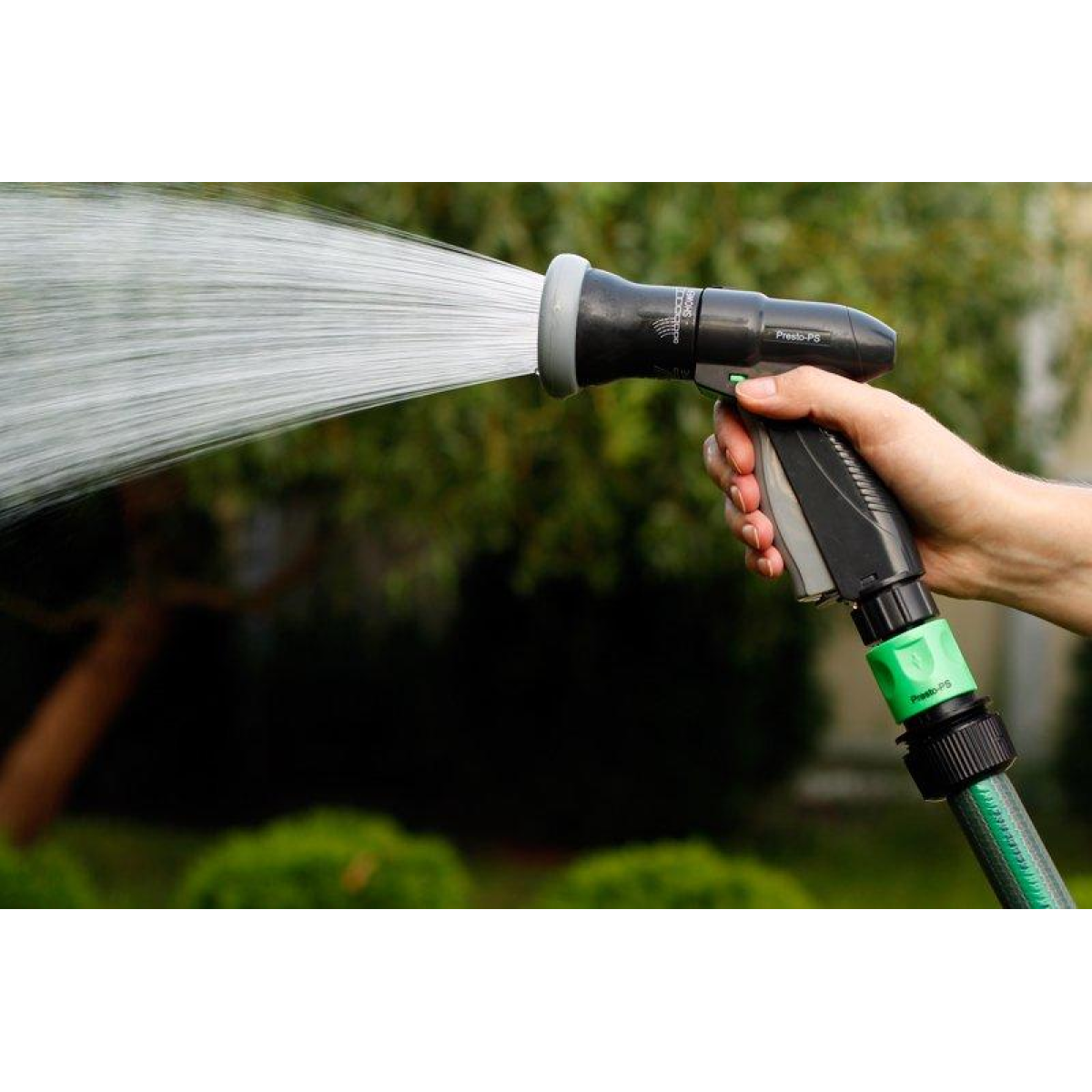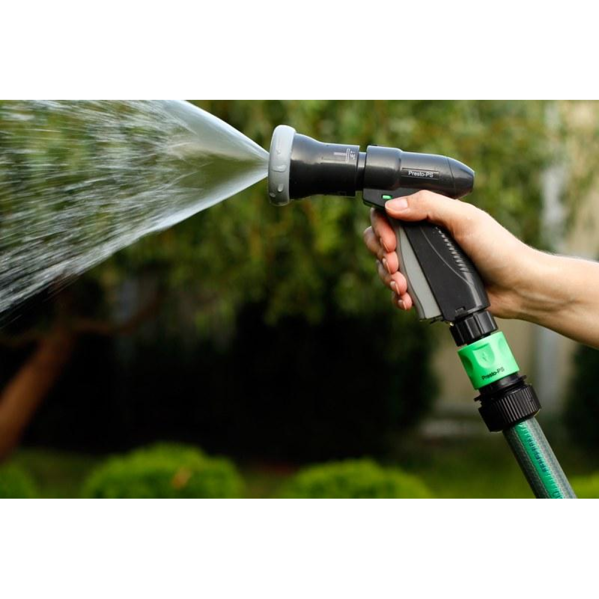 Пістолет для поливу Presto-PS (2048) використовується для ручного поливу газонів середньої та невеликої площі, городів, квітників, прибирання доріжок на прибудинковій території, миття садового інвентарю та техніки. Поворотна головка пістолета має 4 положення і регулює форму струменя і ступінь розпилення води. Можливі режими поливу: жорсткий струмінь, конус, регульований душ. Підключається до садових шлангів діаметром 1/2, 5/8 і 3/4 дюйма за допомогою стандартних конекторів. Рекомендований робочий тиск у системі від 2 до 4 атмосфер. Виготовлений поливальний пістолет з якісного пластику, довговічний, стійкий до механічних пошкоджень, впливу ультрафіолету і водорозчинних добрив.