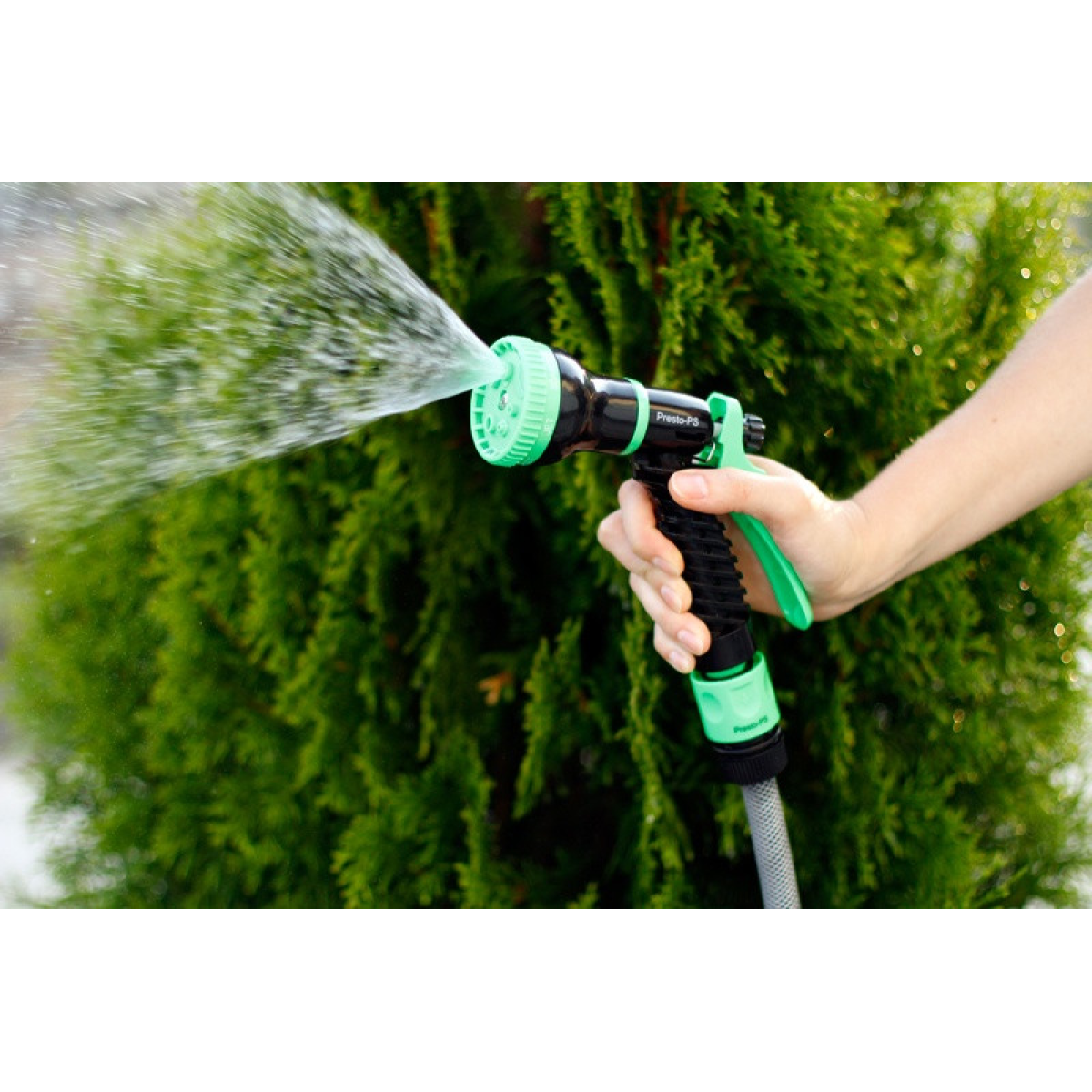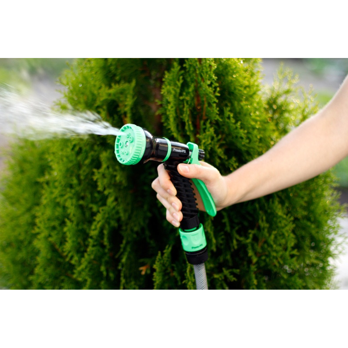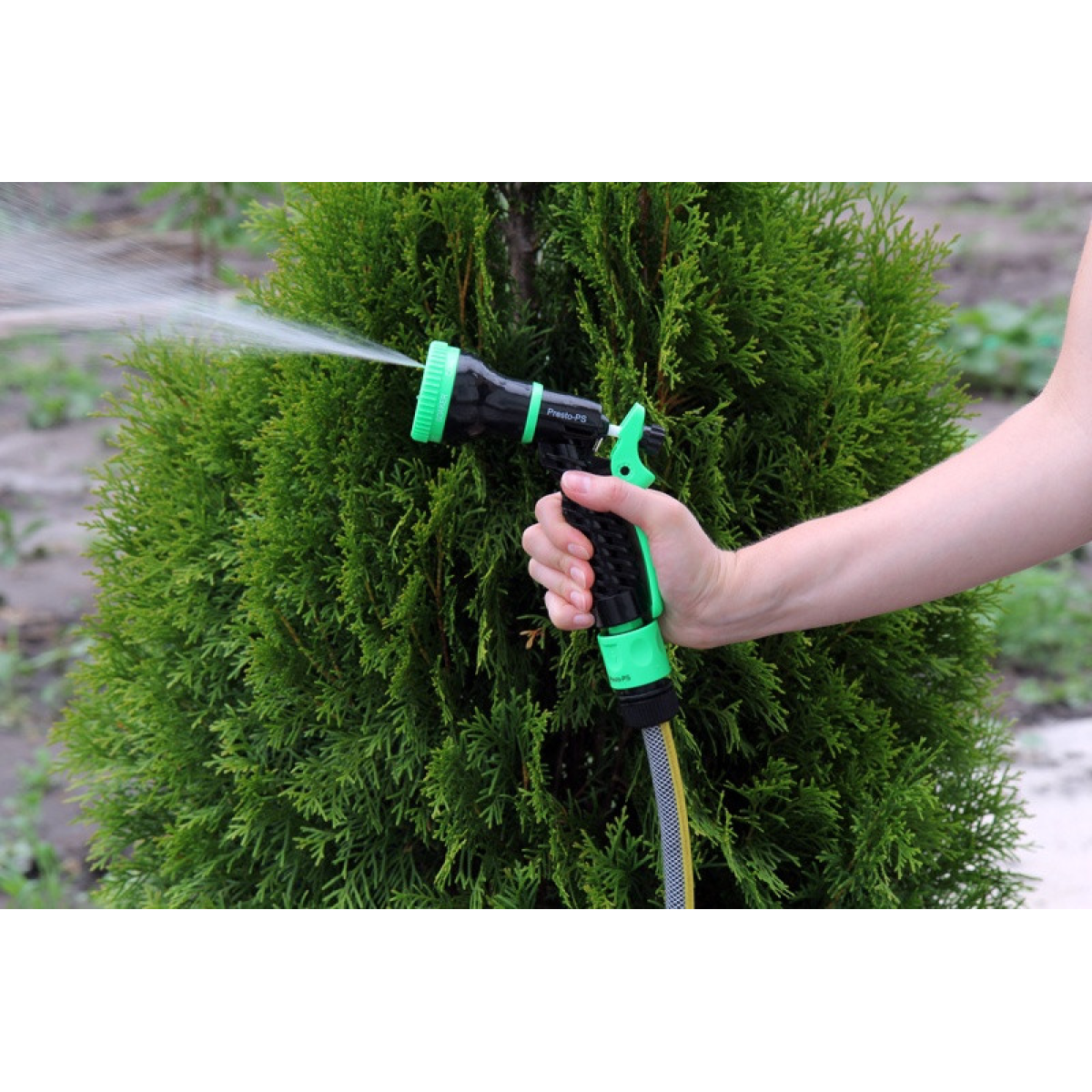 Пістолет для поливу Presto-PS (4448) використовується для ручного поливу газонів середньої та невеликої площі, городів, квітників, прибирання доріжок на прибудинковій території, миття садового інвентарю та техніки. Поворотна голівка пістолета має 7 положень і регулює форму струменя і ступінь розпилення води. Можливі режими поливу: м“який струмінь, жорсткий струмінь, конус, туман, душ, плаский вертикальний, плаский горизонтальний. Підключається до садових шлангів діаметром 1/2, 5/8 і 3/4 дюйма за допомогою стандартних конекторів. Рекомендований робочий тиск у системі від 2 до 4 атмосфер. Виготовлений поливальний пістолет з якісного пластику, довговічний, стійкий до механічних пошкоджень, впливу ультрафіолету і водорозчинних добрив.