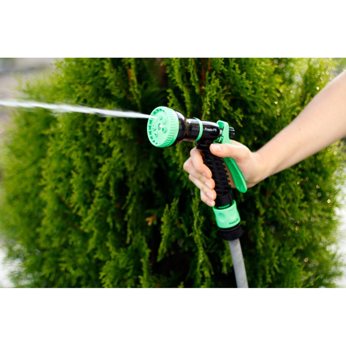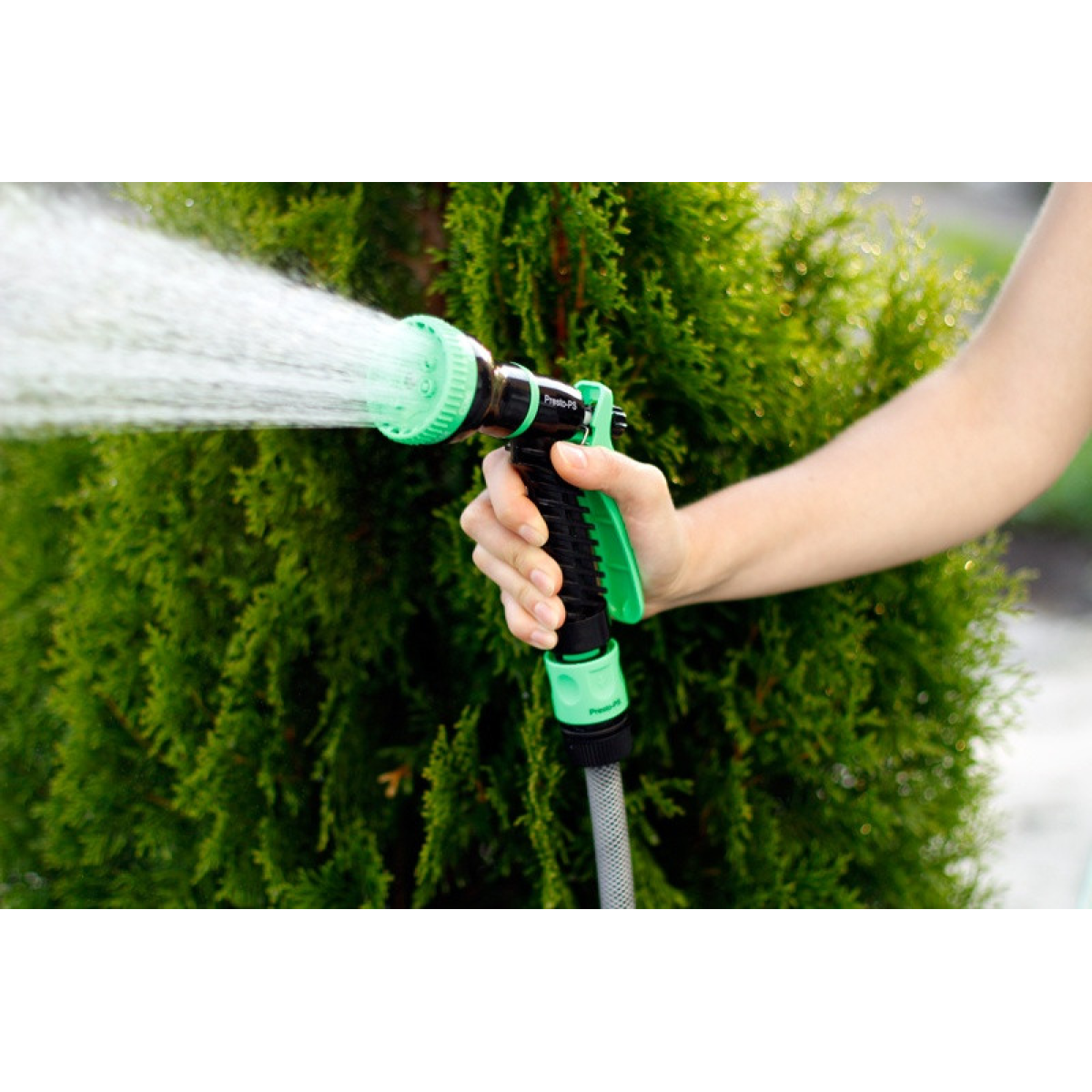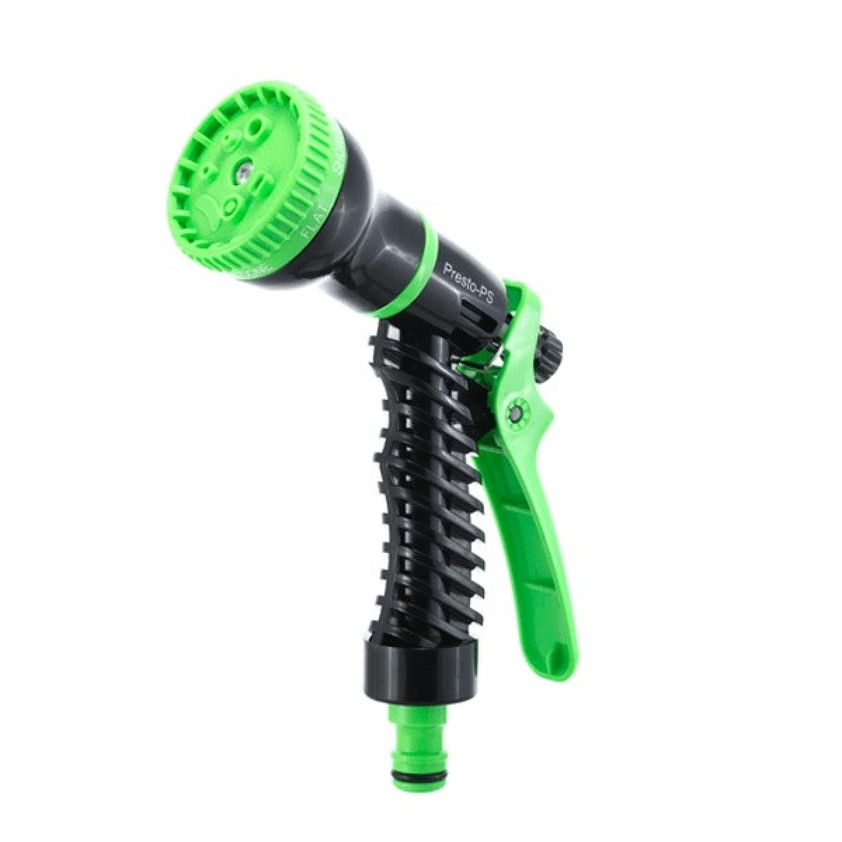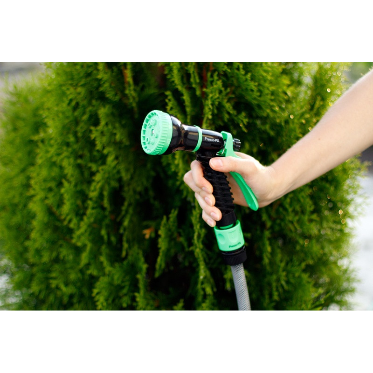 Пістолет для поливу Presto-PS (4448) використовується для ручного поливу газонів середньої та невеликої площі, городів, квітників, прибирання доріжок на прибудинковій території, миття садового інвентарю та техніки. Поворотна голівка пістолета має 7 положень і регулює форму струменя і ступінь розпилення води. Можливі режими поливу: м“який струмінь, жорсткий струмінь, конус, туман, душ, плаский вертикальний, плаский горизонтальний. Підключається до садових шлангів діаметром 1/2, 5/8 і 3/4 дюйма за допомогою стандартних конекторів. Рекомендований робочий тиск у системі від 2 до 4 атмосфер. Виготовлений поливальний пістолет з якісного пластику, довговічний, стійкий до механічних пошкоджень, впливу ультрафіолету і водорозчинних добрив.