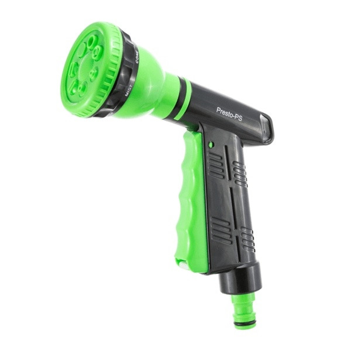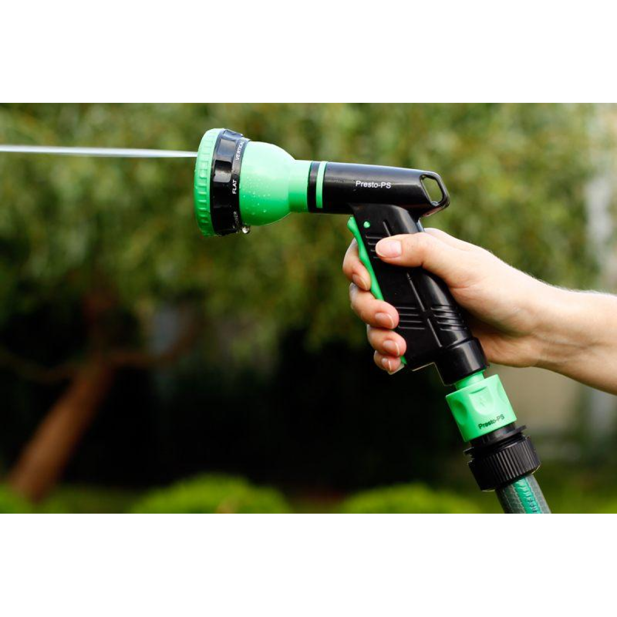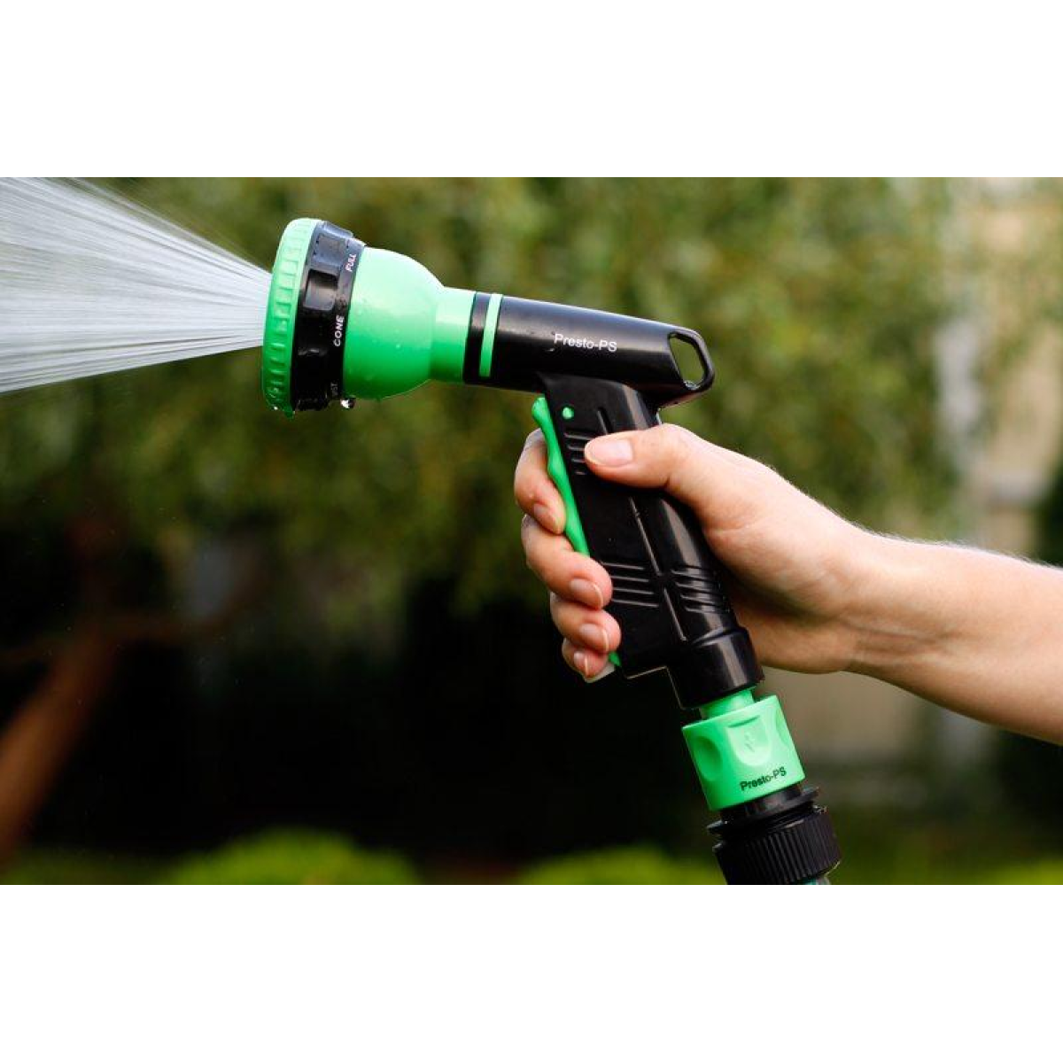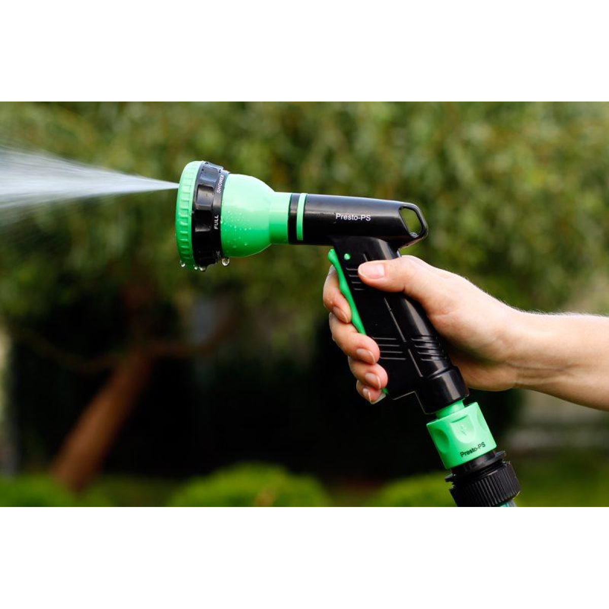 Пістолет для поливу Presto-PS (4442) використовується для ручного поливу газонів середньої та невеликої площі, городів, квітників, прибирання доріжок на прибудинковій території, миття садового інвентарю та техніки. Поворотна головка пістолета має 7 положень і регулює форму струменя і ступінь розпилення води. Можливі режими поливу: м“який струмінь, жорсткий струмінь, конус, туман, душ, плаский вертикальний, плаский горизонтальний. Підключається до садових шлангів діаметром 1/2, 5/8 і 3/4 дюйма за допомогою стандартних конекторів. Рекомендований робочий тиск у системі від 2 до 4 атмосфер. Виготовлений поливальний пістолет з якісного пластику, довговічний, стійкий до механічних пошкоджень, впливу ультрафіолету і водорозчинних добрив.