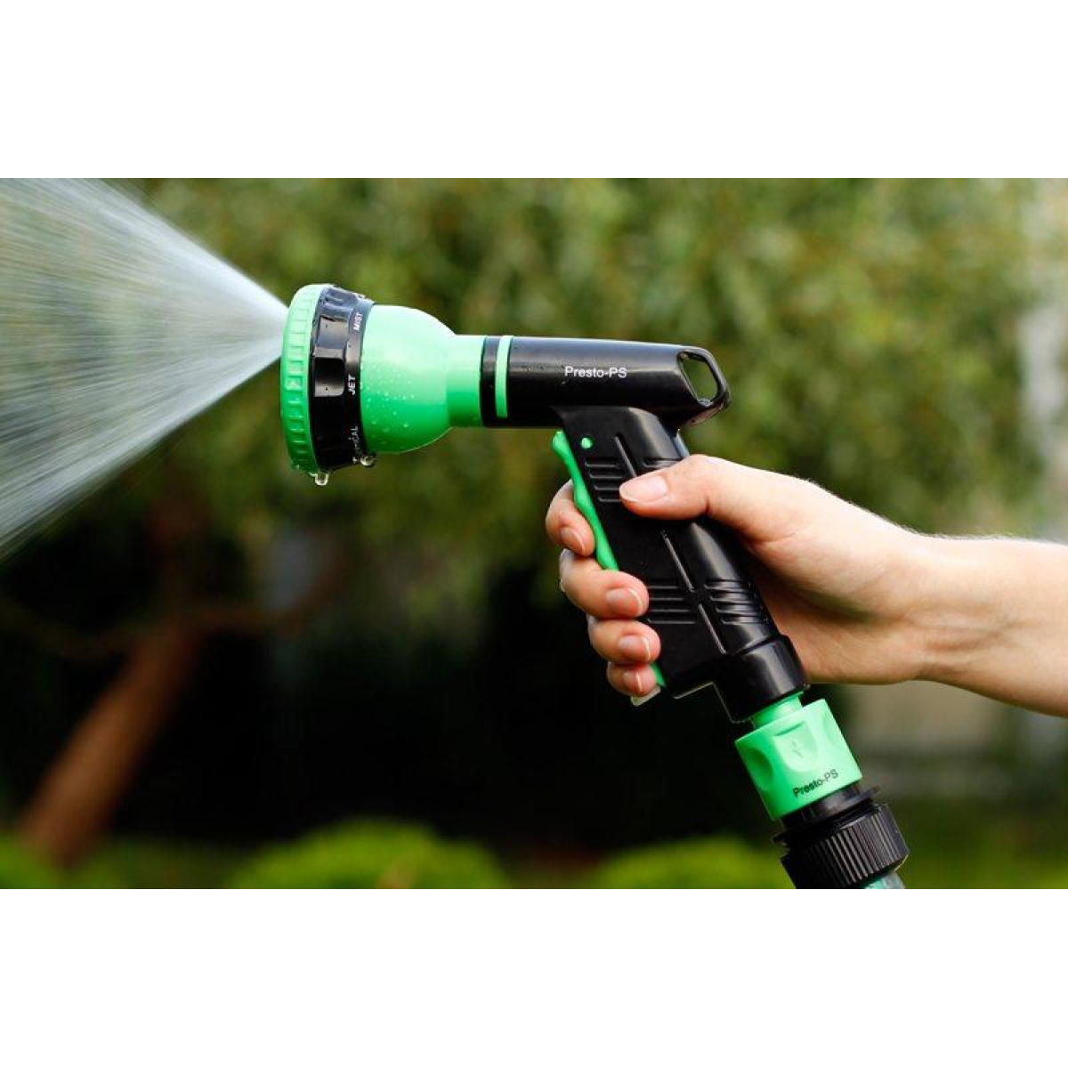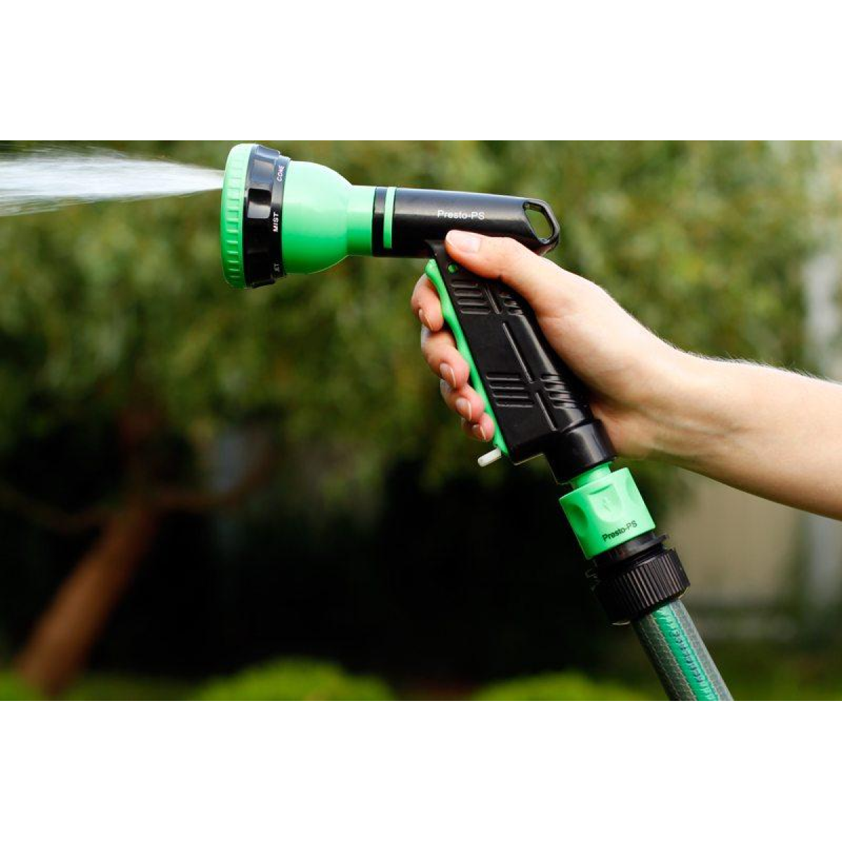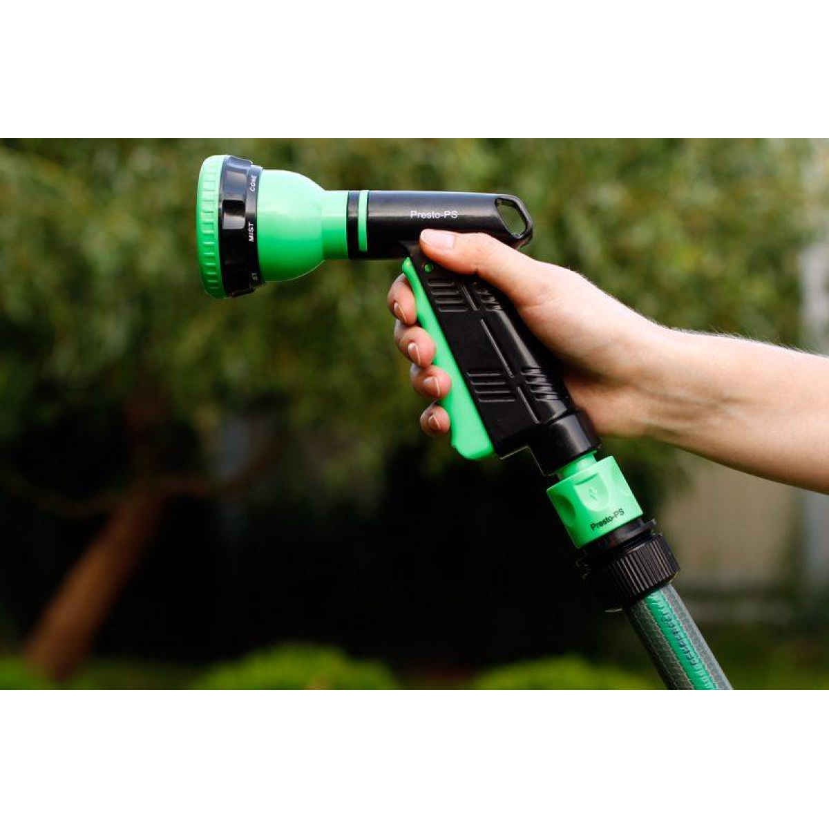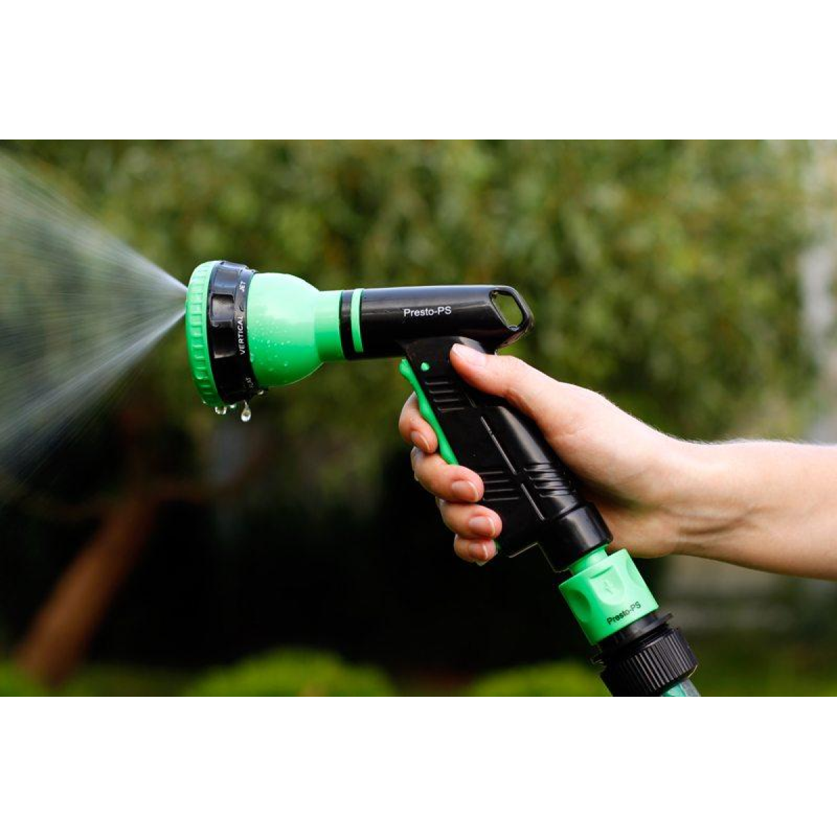 Пістолет для поливу Presto-PS (4442) використовується для ручного поливу газонів середньої та невеликої площі, городів, квітників, прибирання доріжок на прибудинковій території, миття садового інвентарю та техніки. Поворотна головка пістолета має 7 положень і регулює форму струменя і ступінь розпилення води. Можливі режими поливу: м“який струмінь, жорсткий струмінь, конус, туман, душ, плаский вертикальний, плаский горизонтальний. Підключається до садових шлангів діаметром 1/2, 5/8 і 3/4 дюйма за допомогою стандартних конекторів. Рекомендований робочий тиск у системі від 2 до 4 атмосфер. Виготовлений поливальний пістолет з якісного пластику, довговічний, стійкий до механічних пошкоджень, впливу ультрафіолету і водорозчинних добрив.