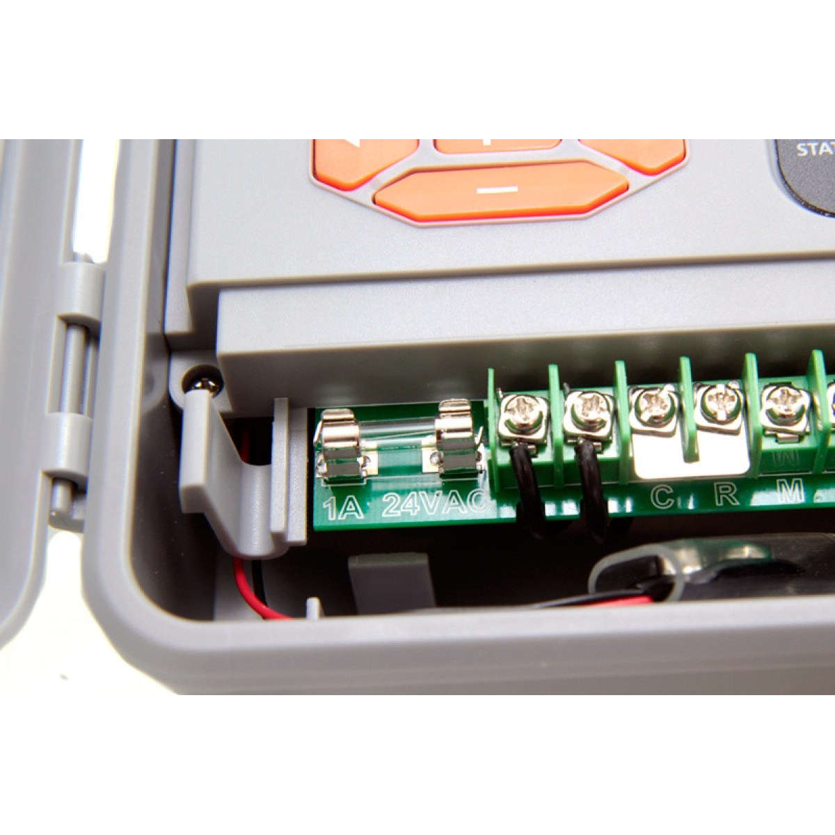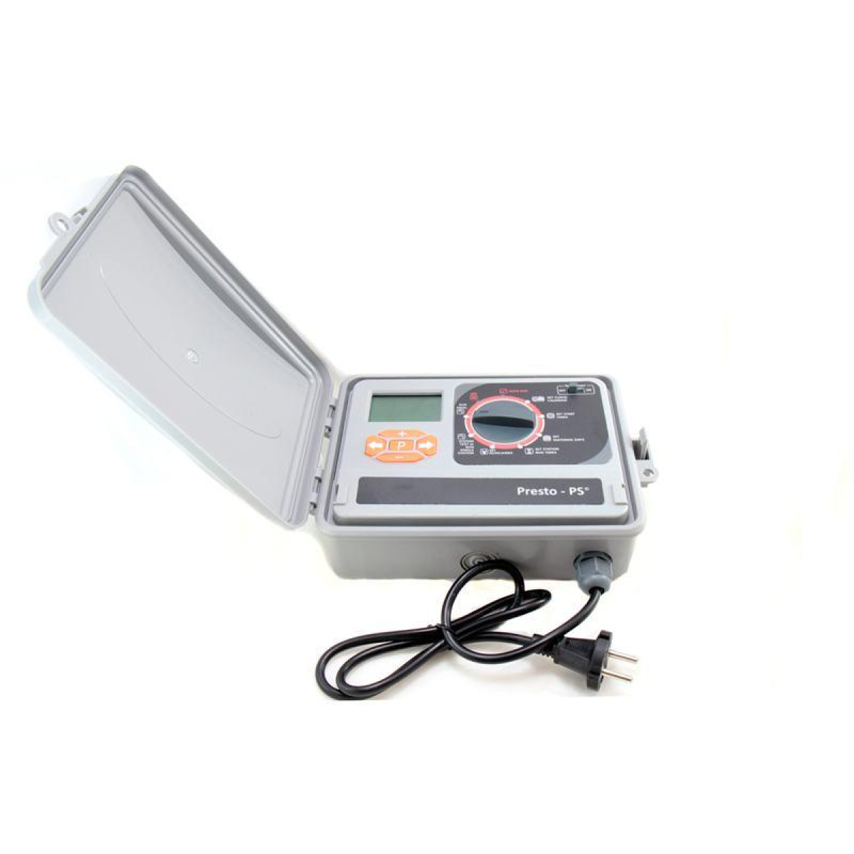 Особливості Електронний контролер поливу Presto-PS 7805 використовується в комбінації з електромагнітними клапанами для побудови автоматичних систем поливу на присадибних ділянках і в умовах невеликих фермерських господарств. Оптимально підходить для керування поливом газонів і галявин у паркових зонах. Дає змогу одночасне під“єднання до 11 незалежних ліній зрошення, що робить контролер єдиним приладом для керування поливом усієї ділянки. Кожну лінію можливо налаштувати окремо. Час поливу задається в інтервалі від 1 хвилини до 12 годин 59 хвилин. Максимальна кількість сесій - 6 окремих програм, у кожної з яких є 6 налаштувань часу. Передбачено можливість синхронізації між насосом і клапанами - в той час як відкривається магнітний клапан, одночасно вмикається водний насос. Конструкція контролера передбачає можливість під“єднання датчика дощу, що дає змогу економити на зрошенні залежно від погодних умов. Корпус контролера є волого захищеним, що дає змогу встановлювати його зовні приміщень. Процес монтажу таймера не займає багато часу. Інтуїтивно зрозумілий інтерфейс дає змогу легко запрограмувати контролер на потрібний режим та інтервал поливу. Резервна батарея 6LR61 дає змогу програмувати контролер за відсутності змінного струму і зберігає налаштування в разі припинення живлення. Призначений для роботи з клапанами з керуючою напругою AC 24V. Для продовження терміну служби системи поливу рекомендується використання в системі подачі води фільтра грубого очищення. Переваги Широкий спектр регулювання режимів поливу; До 11 незалежних секцій зрошення; ЖК-дисплей, що легко читається; Індикація низького заряду батареї; Відображення поточного часу та режиму роботи; Простота монтажу; Легке і зручне програмування; Можливість роботи у парі з датчиком дощу; Захист від короткого замикання; Зручно використовувати у комбінації з клапанними боксами . Коротка інструкція з монтажу контролера: Змонтувати на початку кожної гілки поливу у клапанний бокс електромагнітний клапан;З іншого боку клапанів підключити труби магістрального водопостачання; Поруч із блоком клапанів у приміщенні на стіні закріпити контролер; Підключити клапани до контролера;За наявності під“єднати до контролера датчик дощу; Вставити батарейку в контролер; Виставити потрібний час поливу.