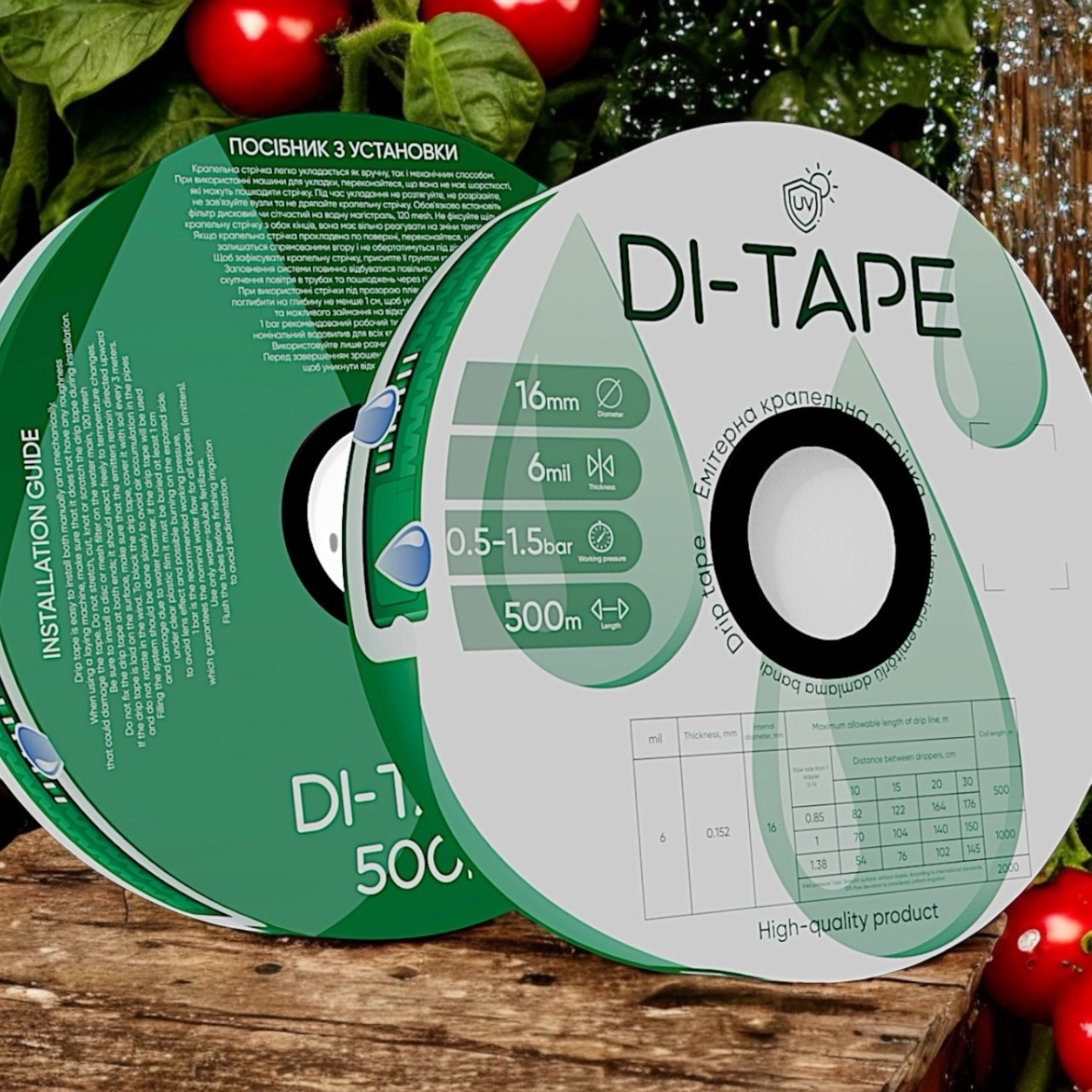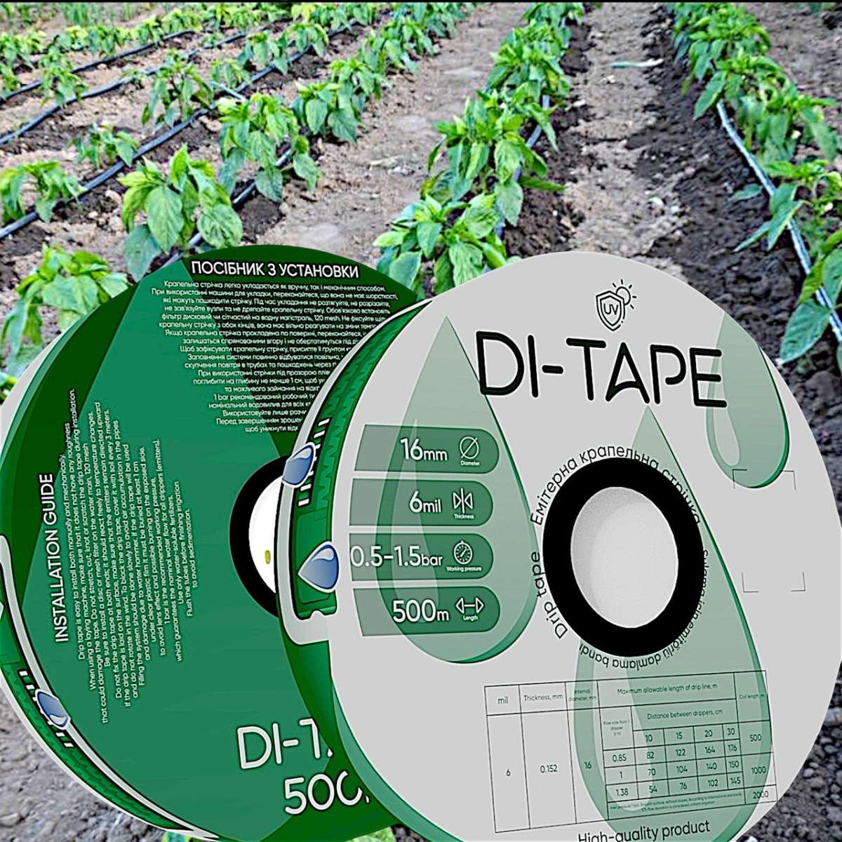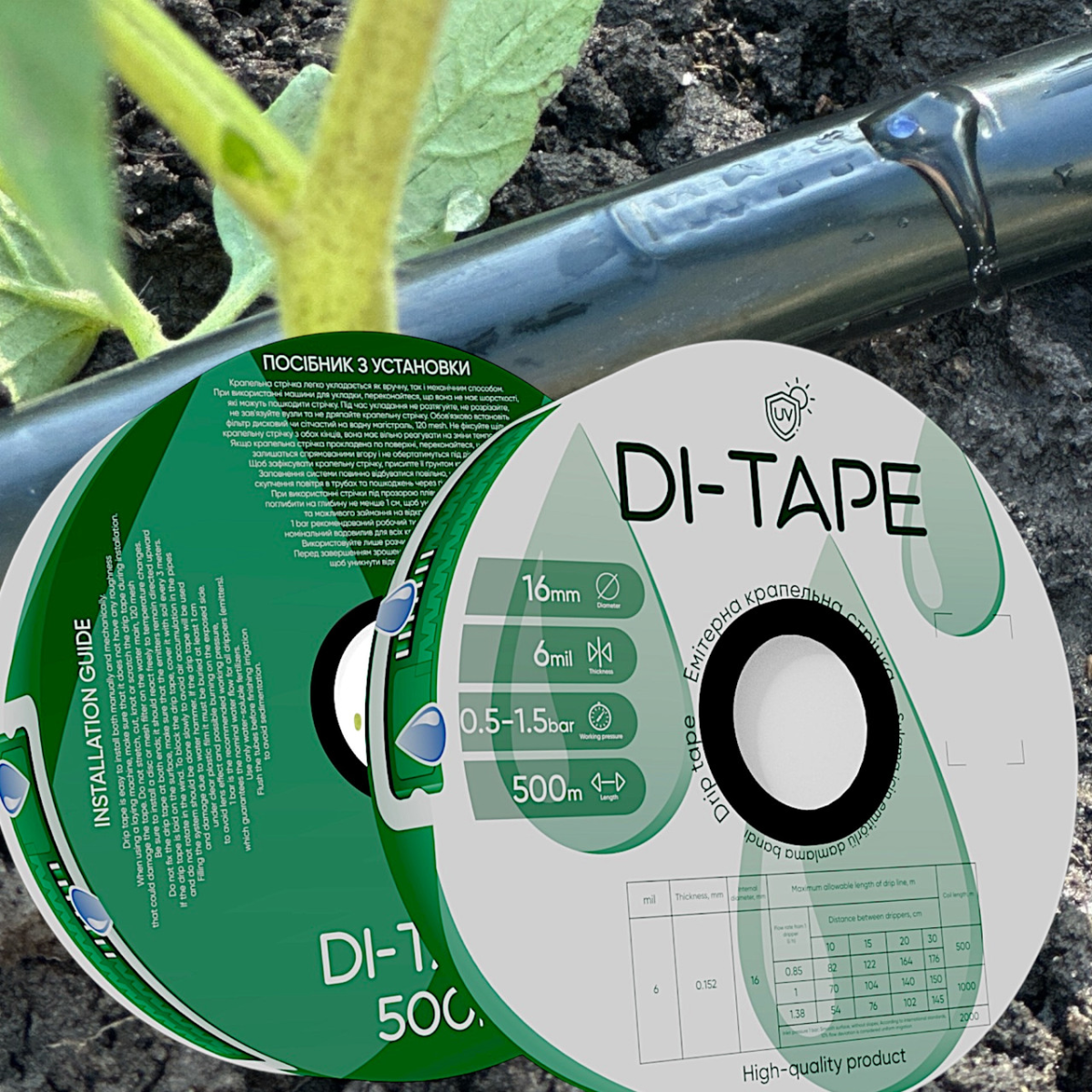 Особливості Стрічка є універсальним і найпоширенішим елементом прикореневих систем крапельного поливу. Емітерна крапельна стрічка турецького виробництва Di-Tape дає змогу забезпечувати оптимальний полив на будь-яких площах з ухилом до 3%. Крапельна стрічка Di-Tape (DI-30-2000) це гнучка трубка з товщиною стінки 0.15 мм (6 mil) і вбудованими крапельницями (емітерами), які розташовуються через кожні 30 см, забезпечуючи максимально сприятливі умови для вирощуваних культур. Стрічка крапельного поливу має тривалий термін служби, завдяки вбудованим крапельницями стійка до засмічення і забезпечує більш точне і більш стабільне зрошення. Для запобігання забрудненню кожна крапельниця має свій вбудований фільтр із лабіринтом у формі зубчастого каналу. Крапельниці вбудовані в стінку стрічки за допомогою екструзії і чинять мінімальний опір водяному потоку. Подвійна система захисту забезпечує максимальну надійність роботи крапельниць, за рахунок цього досягається точне, стабільне зрошення і висока однорідність поливу по всій довжині. Перший рівень захисту широкий - фільтраційний канал на вході в крапельниці запобігає проникненню зважених часток всередину крапельниці. Другий рівень захисту - турбулентний потік, спеціальна форма каналу створює вихровий потік води, і частинки, що потрапили в крапельницю, вимиваються під час зміни швидкості потоку води поблизу крапельниці. Крапельна стрічка є ідеальним рішенням для прикореневого зрошення і внесення всіх видів водорозчинних добрив. Застосовується для вирощування пересічних культури, в теплицях для вирощування овочів і промислових культури, відмінно підходить для дрібних господарських ділянок. Завдяки широкому асортименту фітингів стрічку просто монтувати в уже наявну систему поливу. Стрічка легко і швидко стелиться. Завдяки вмісту в складі стрічки ультрафіолетового фільтра, знижується вплив сонячних променів, що гарантує використання стрічки 3 роки і більше. Використовуйте тільки розчинні у воді добрива. Перед завершенням зрошення промивайте трубки, щоб уникнути відкладення осаду. Максимально допустима довжина однієї гілки становить 150 метрів, витрата води з однієї крапельниці - 1,00 літр на годину, це обов“язково враховувати для правильного підбору складових системи поливу крапельною стрічкою. Рівномірність зрошення 85-90 %. Переваги Висока рівномірність поливу; Широкий вхідний фільтр, стійкий до засмічення; Лабіринт із турбулентним потоком запобігає осадженню частинок; Можливість поливу джерелом води бак на висоті 2 метри; Прискорене дозрівання рослин і збільшення врожайності до 40%; Збереження оптимального рівня вологості ґрунту тривалий час; Можливість використання на великих площах і дрібних господарських ділянках; Дає змогу проводити внесення комплексних водорозчинних добрив. Застосування Полив рядових культур на відкритому та закритому ґрунті; Полив промислових культур у парниках і теплицях;Домашні ділянки. Коротка інструкція з монтажу крапельної стрічки: Укласти гілки крапельної стрічки вздовж рядів; Перпендикулярно рядам укласти магістральну трубу; На початку магістральної труби змонтувати фільтр для очищення води: сітчастий або дисковий; З“єднати стрічку з трубою подачі за допомогою стартерів або кранів; Одягнути стрічку на стартер і закріпити за допомогою притис