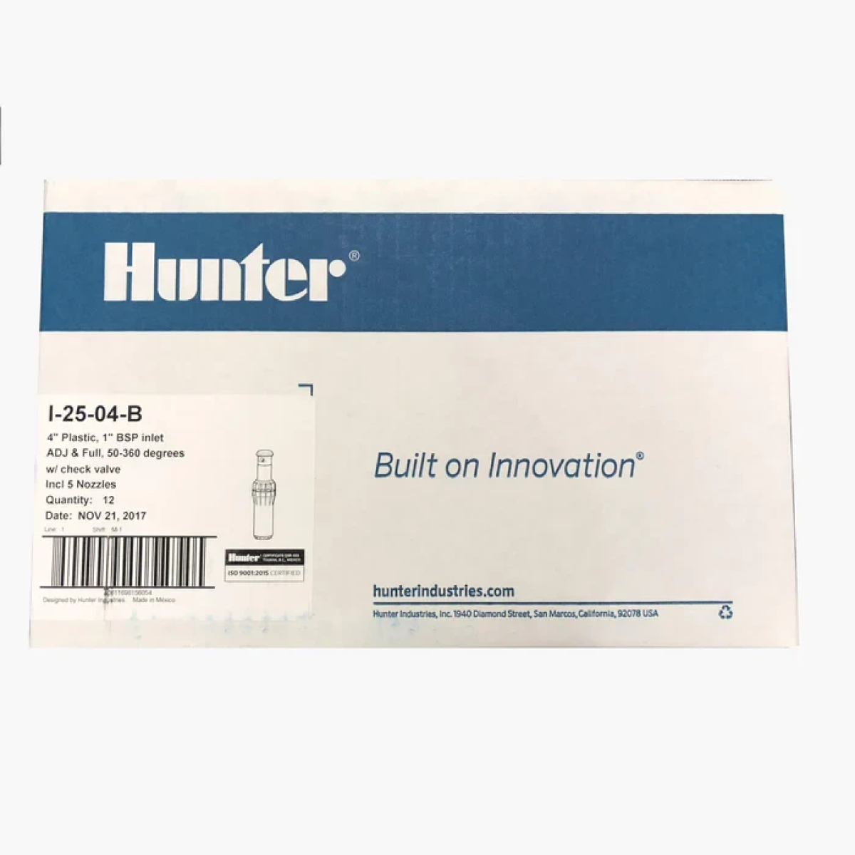Роторний дощувач Hunter I-25-04-B виконує роботу з потужністю, ефективністю та надійністю комерційного рівня. Завдяки великому радіусу поливу від 11,9 до 21,6 м, цей ротор може використовуватися в різних галузях. Його компактна, дуже міцна конструкція поставляється з опціональною надставкою із нержавіючої сталі для міцності. З 5-річною гарантією, роторний дощувач Hunter I-25-04-B також має опції для регенерації води та високої швидкості. Вмонтований стандартний зворотний клапан та доступний широкий вибір високопродуктивних форсунок. Ефективні, міцні та надійні ротори Hunter I-25-04-В працюють день у день і вам нема про що турбуватися.