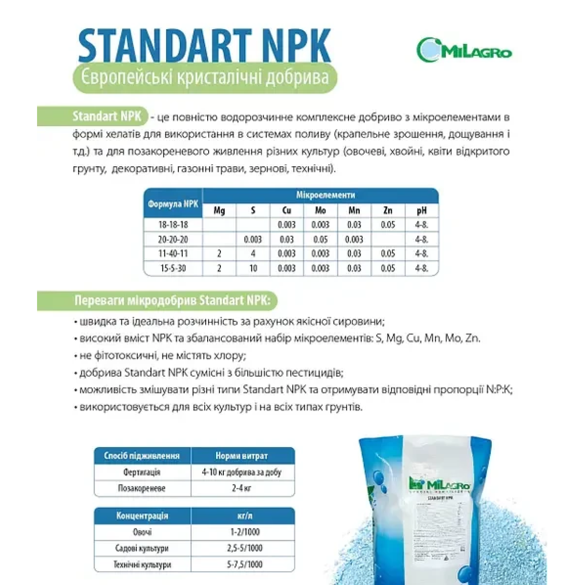 Добриво Milagro Standart NPK 20-20-20 +S+МЕ, 10 кг все найцікавіше тут - відповіді на запитання тут - +38 097 808 17 40 Standart NPK - це повністю водорозчинне комплексне добриво з мікроелементами в формі хелатів для використання в системах поливу (крапельне зрошення, дощування і т.д.) та для позакореневого живлення різних культур (зернові, овочеві, технічні, хвойні, декоративні, квіти відкритого грунту, газонні трави). ПЕРЕВАГИ МІКРОДОБРИВ STANDART NPK: Швидка та ідеальна розчинність за рахунок якісної сировини; Високий вміст NPK та збалансований набір мікроелементів: S, Mg, Ca, B, Cu, Mn, Mo, Zn, Fe в хелатній формі ЕDТА; Не фітотоксичні, не містять хлору; Добрива Standart NPK сумісні з більшістю пестецидів; Можливість змішувати різні типи Standart NPK та отримувати відповідні пропорції N:P:K; Застосовуються на всіх культурах і на всіх типах грунтів. Вміст елементів живлення добрив Standart NPK Назва N P K B Cu Fe Mo Mn Zn pH Standart NPK 20-20-20 20 20 20 0,05 0,006 0.03 0,004 0,003 0.01 4-9 Норми витрат добрив Standart NPK Спосіб підживлення: Норми витрат Кореневе підживлення 2-20 кг/ 20000 л води Позакореневе підживлення 1-6 кг/ 200-500 л води Пакування: 10 кг Країна виробник: Італія У наc Ви можете придбати товар та замовити доставку в будь-який населений пункт України. Ціни? - Вас приємно здивують Наша цінова пропозиція на даний момент є найбільш вигідною на ринку. Звертайтеся та відчуйте всі переваги нашої професійної команди. autorainpro.com.ua З нами співпрацювати - максимально легко!