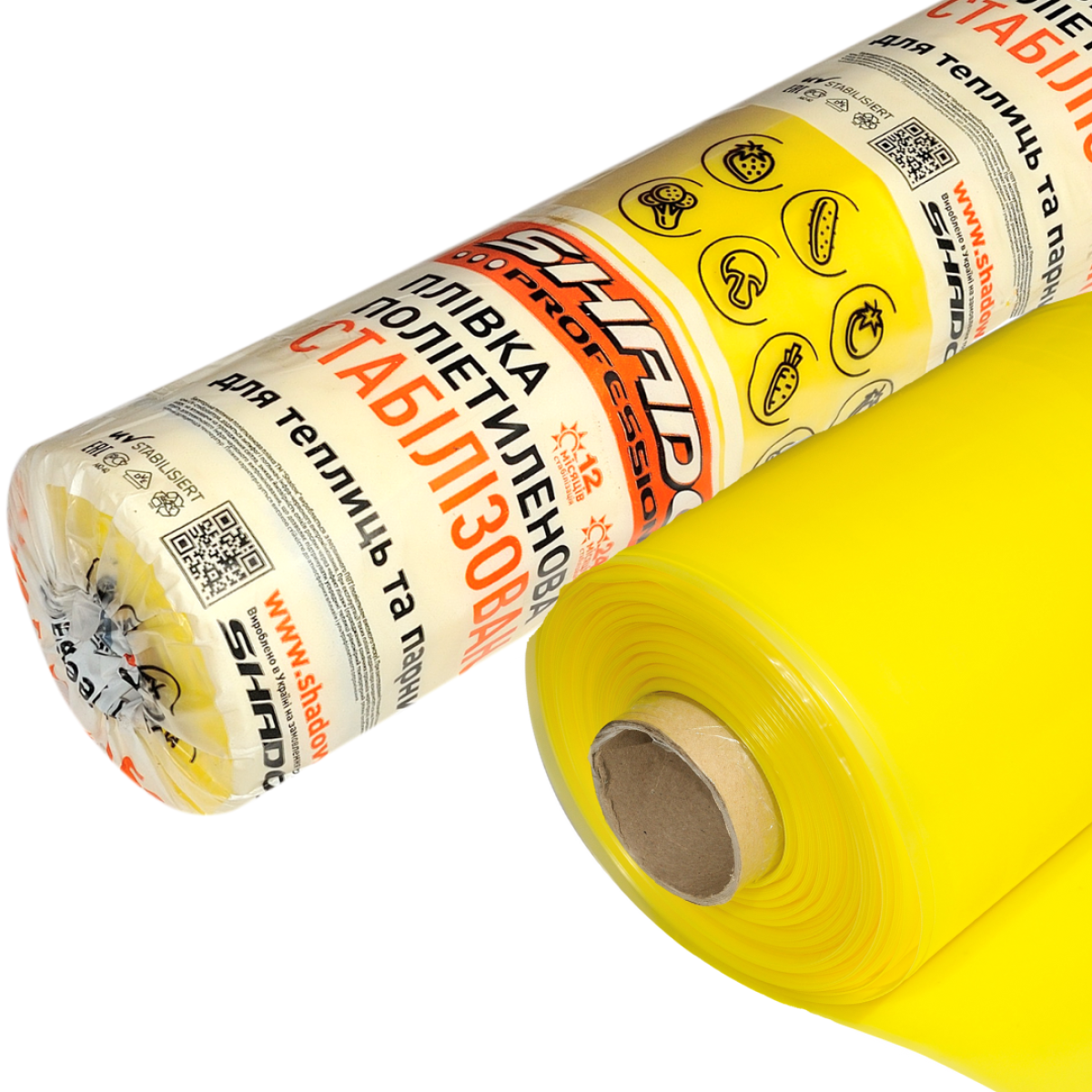Багаторічна теплична плівка поліетиленова ТМ “Shadow“ виготовляється з первинної ПВТ (поліетилен високого тиску). При виготовленні тепличної плівки спеціального призначення, крім UV-стабілізатора, додається антифог і поглинач інфра-червоного випромінення. При експлуатації таких плівок водяна пара конденсується на поверхні у вигляді тонкого водяного шару, не впливаючи на проходження світла, зникає ймовірність опіків рослин через «ефект лінзи» проходження сонячних променів через краплі конденсату). ІК-поглинач попереджає втрату довгохвильового інфрачервоного червоного випромінювання, що дозволяє підтримувати усередині теплиці рівномірний температурний режим (особливо вночі) і захищати рослини, які чутливі до перепадів температур. Плівка характеризується високою стійкістю до атмосферних впливів і ультрафіолетового опромінення. Жовта плівка з додаванням 1% UV стабілізатора (Гарантійний термін експлуатації 12 місяців) в наявності за кращою ціною від виробника.